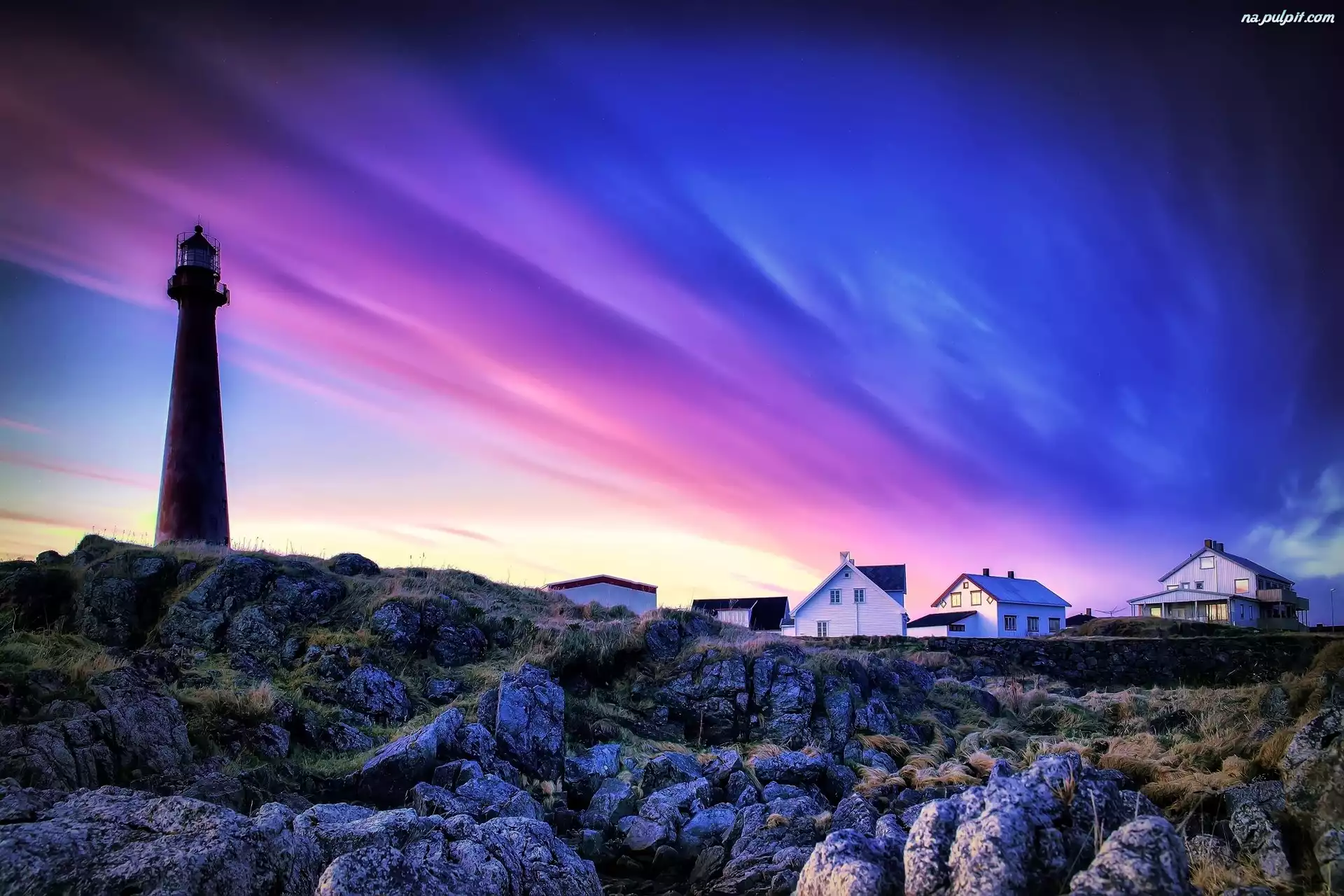 Morska, Kolorowe, Niebo, Domy, Latarnia, Skały