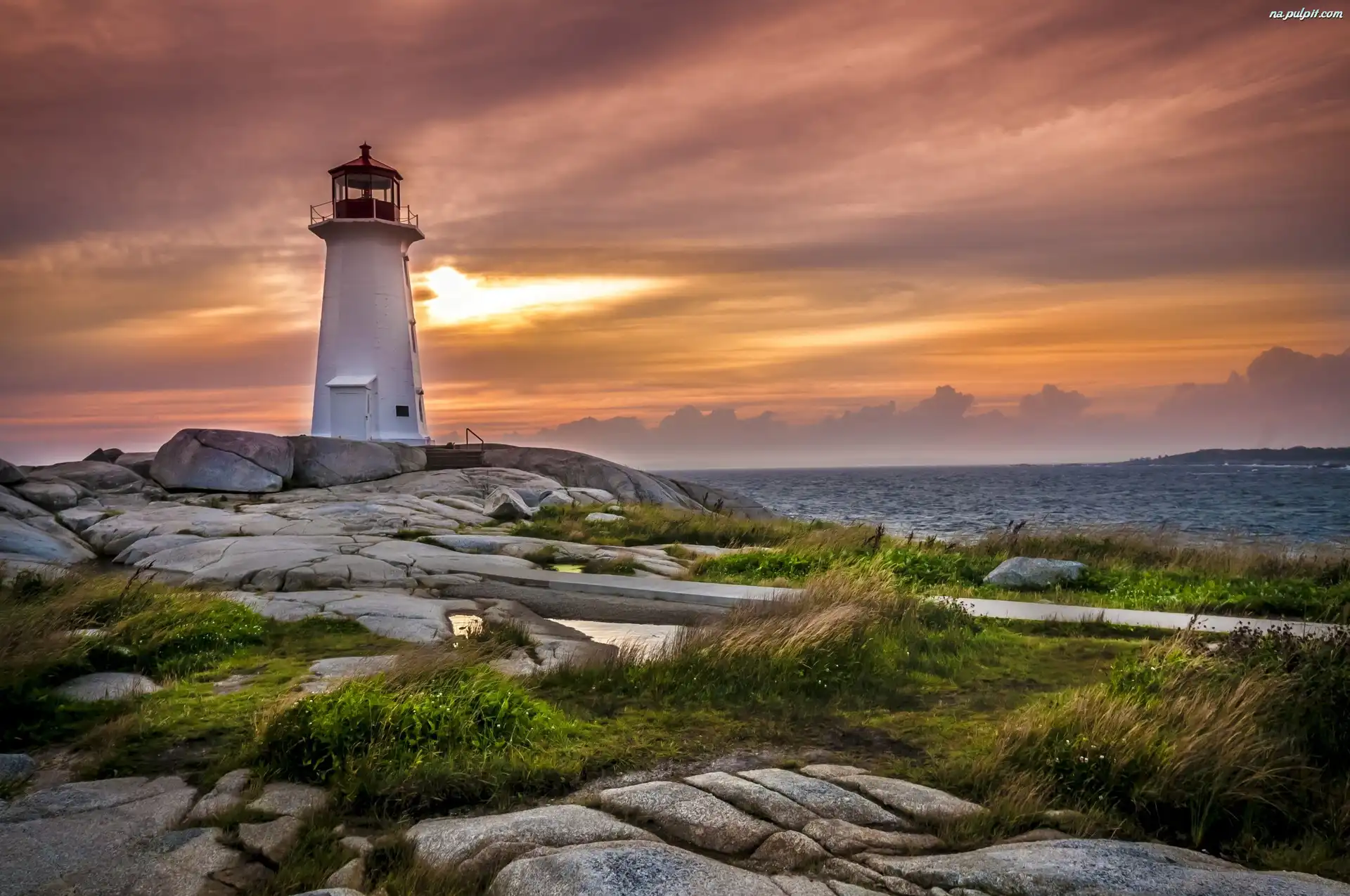 Chmury, Latarnia morska: Peggys Point Lighthouse, Morze, Skały, Kamienie, Kanada, Trawa Na Pulpit
