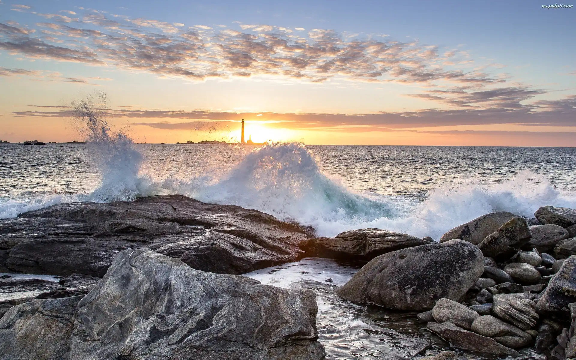 Latarnia morska, Kamienie, Wschód słońca, Fale, Morze, Skały Na Pulpit