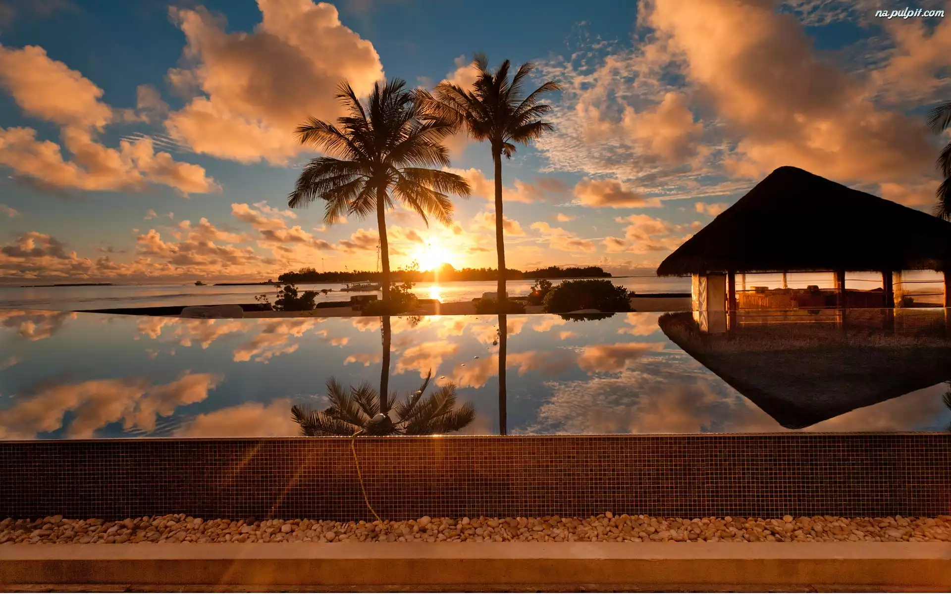 Morze, Domek, Odbicie, Zachód, Chmury, Słońca Na Pulpit