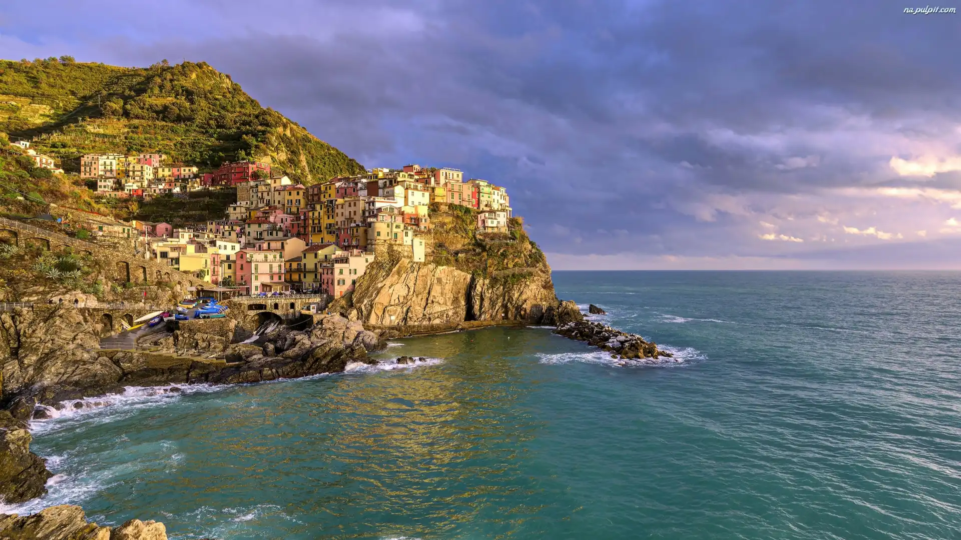 Gmina Riomaggiore, Cinque Terre, Manarola, Morze Liguryjskie, Liguria, Włochy, Skały, Wybrzeże, Domy Na Pulpit |