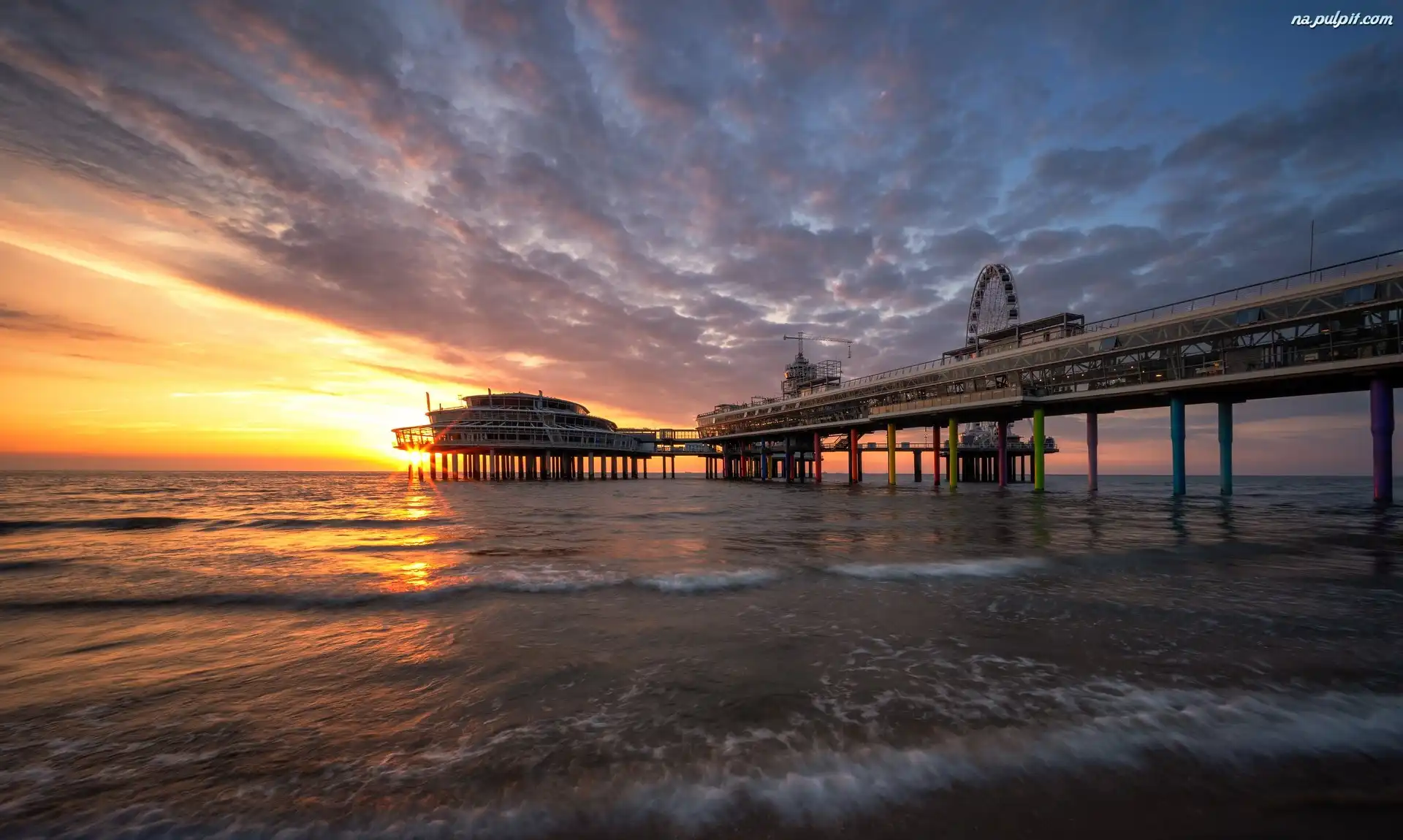 Zachód słońca, Holandia, Morze, Molo, Scheveningen, Chmury Na Pulpit
