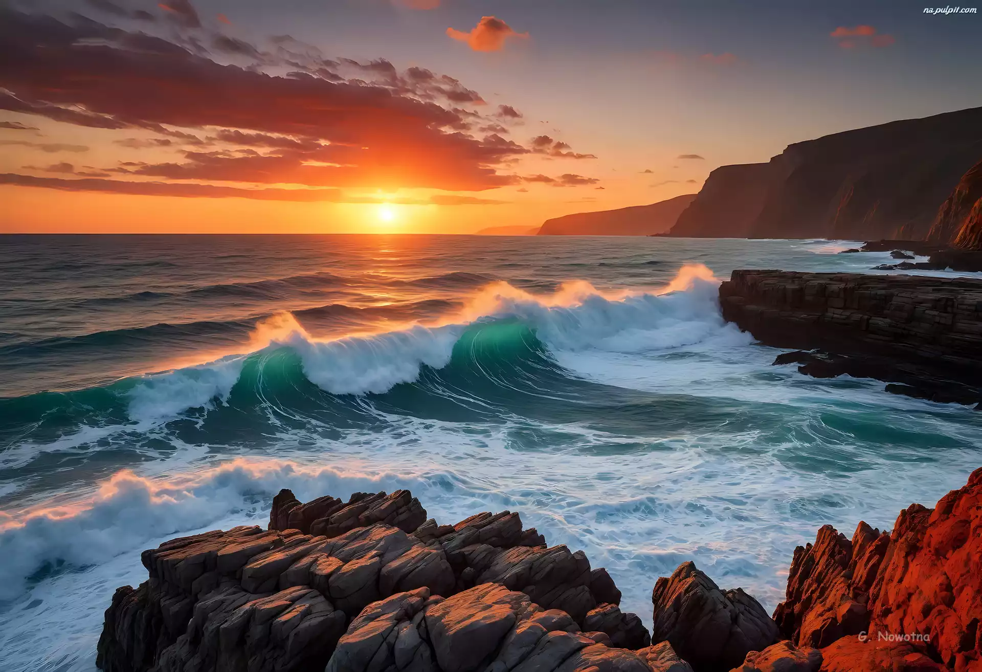 Skały, Morze, Klify, Zachód słońca Na Pulpit