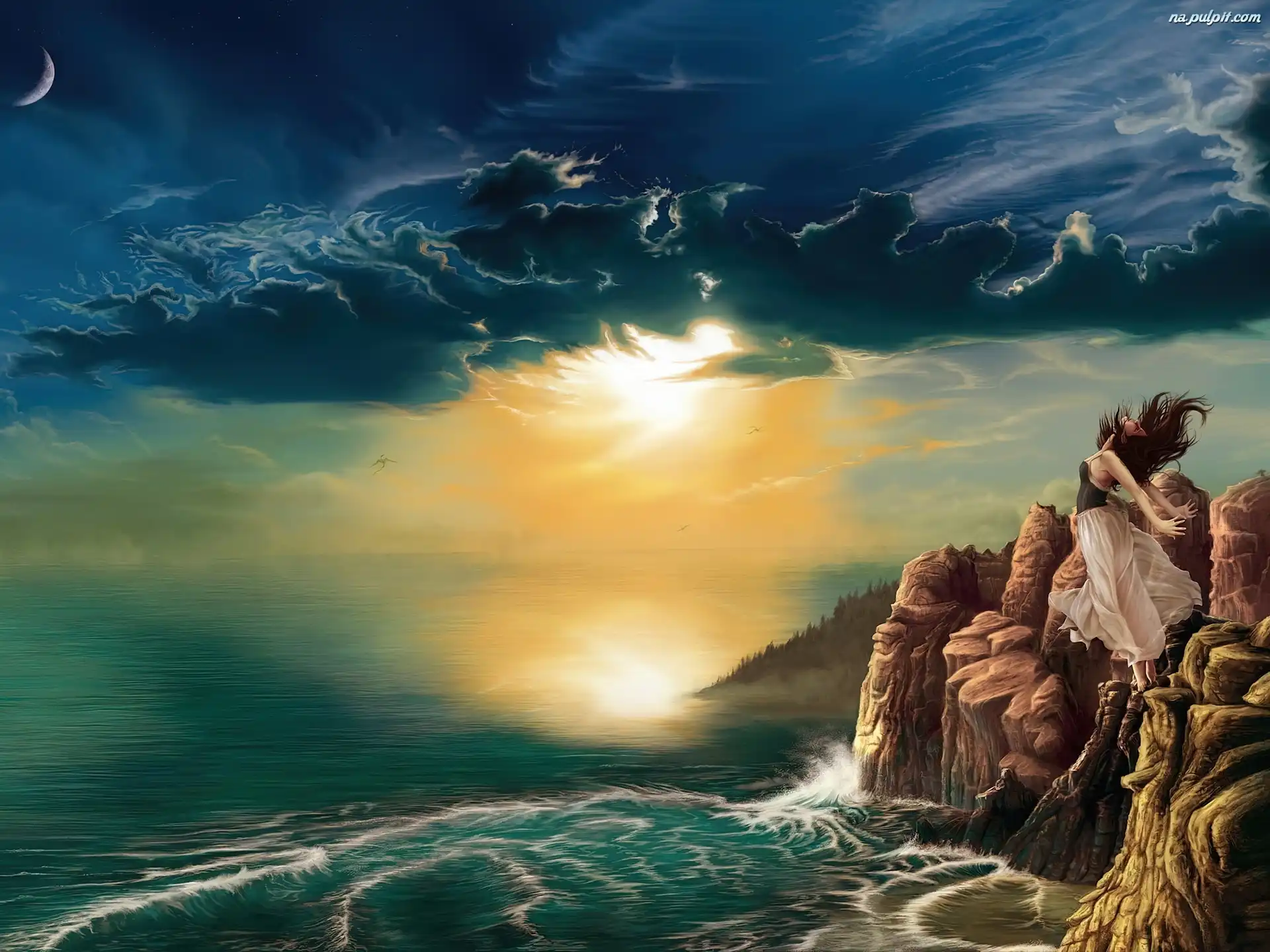 Morze, Skok, Kobieta, Skały Na Pulpit