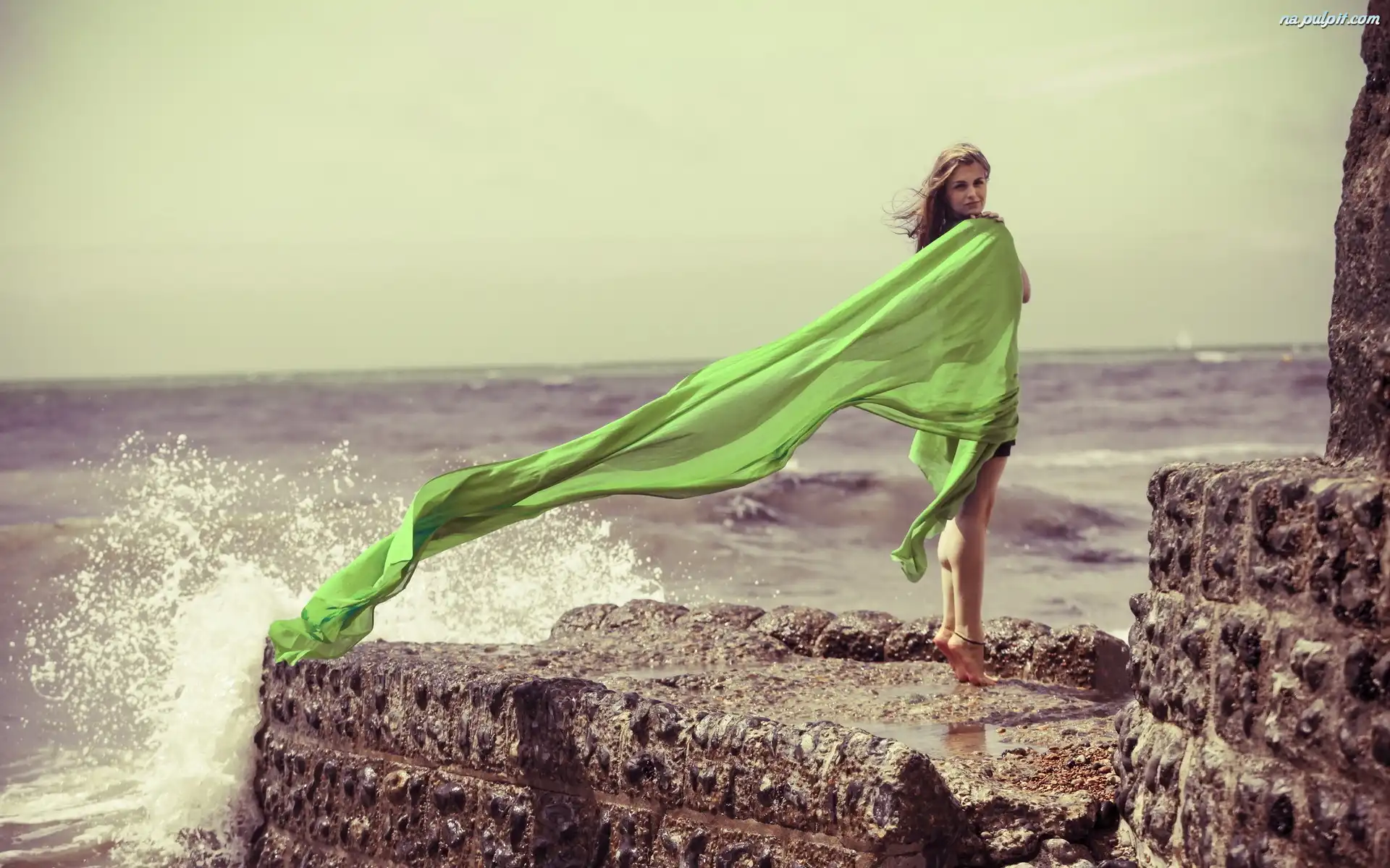 Morze, Szal, Zielony, Kobieta, Skały Na Pulpit