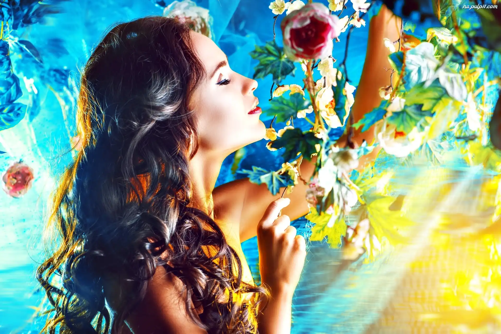 Morze, Włosy, Kobieta, Kolorowe Kwiaty