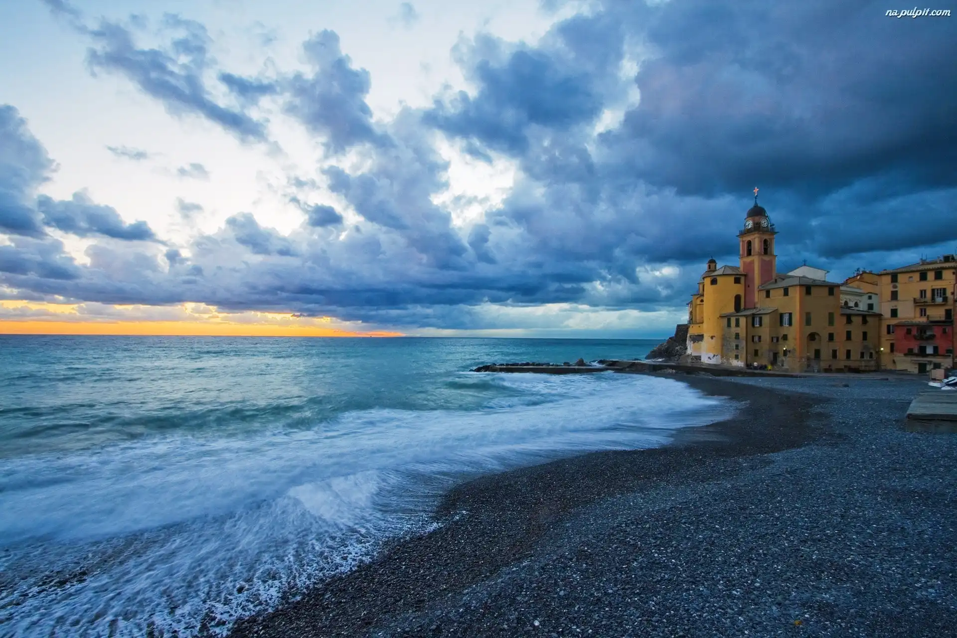 Morze, Liguria, Włochy, Chmury, Kościół, Camogli