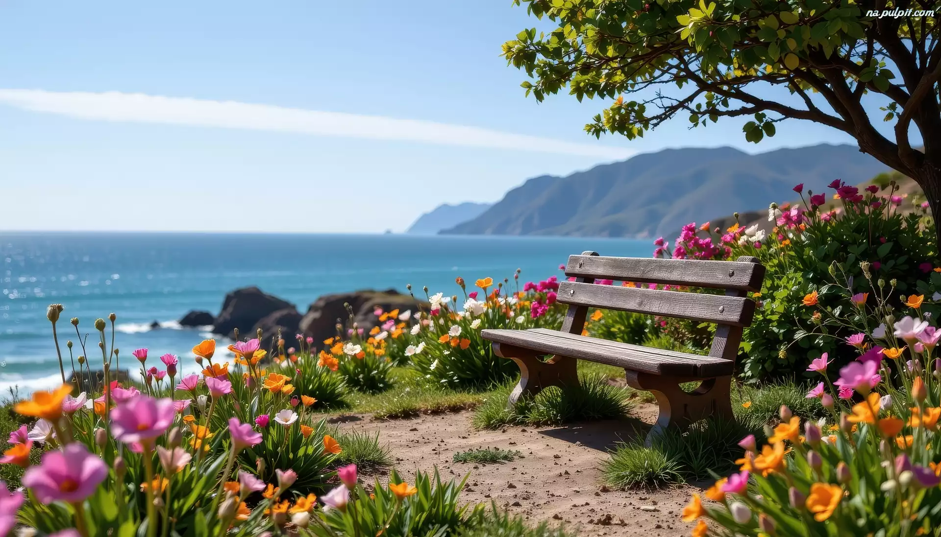 Ławka, Kwiaty, Drzewo, Morze Na Pulpit