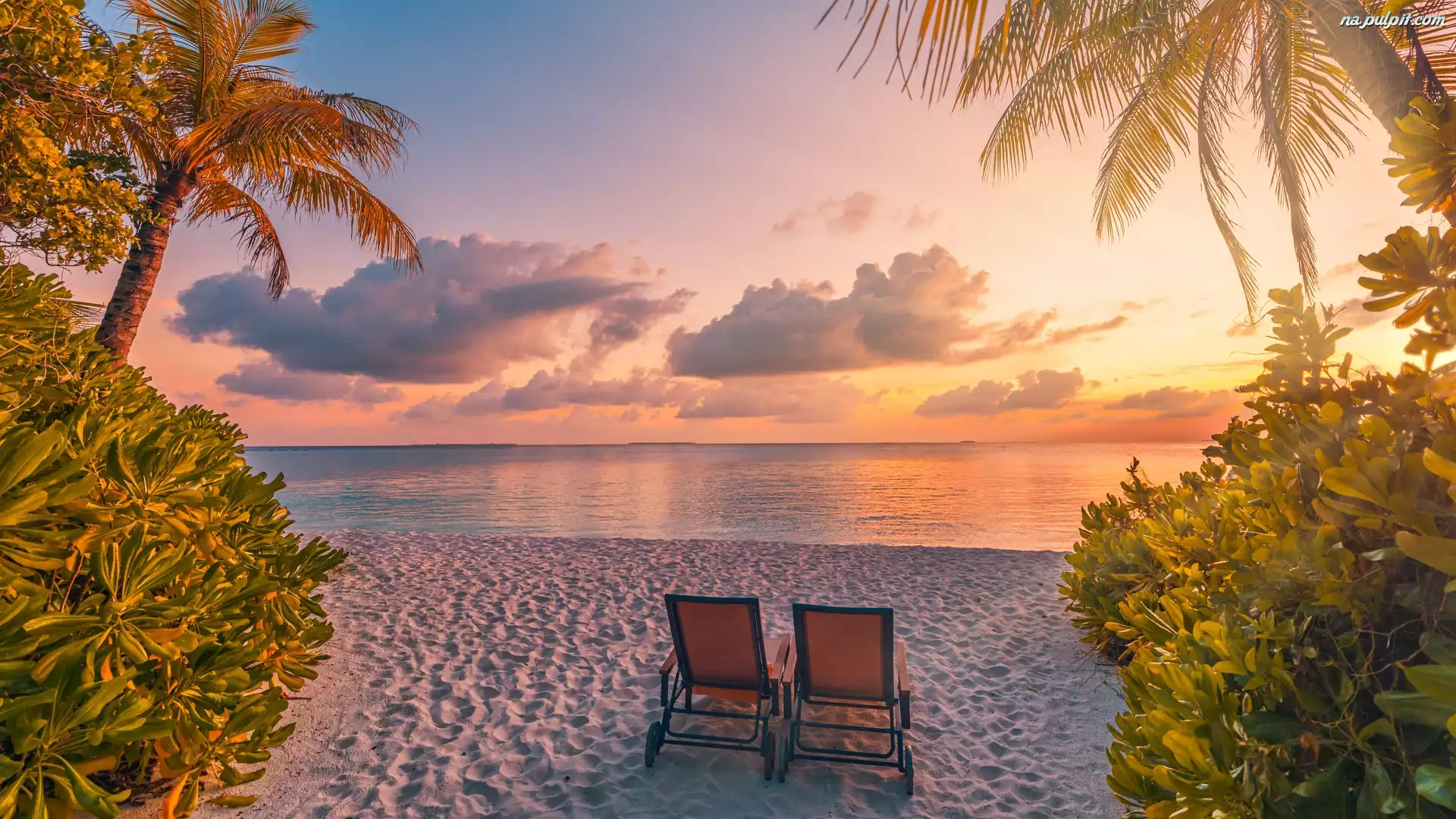Leżaki, Morze, Plaża, Chmury, Palmy Na Pulpit