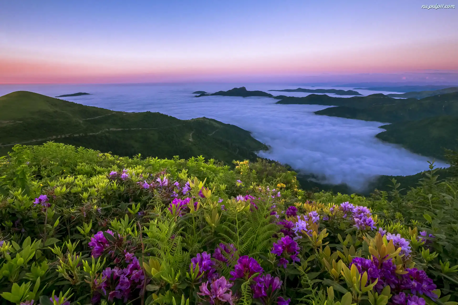 Skały, Morze, Zachód słońca, Kwiaty, Wybrzeże, Mgła Na Pulpit