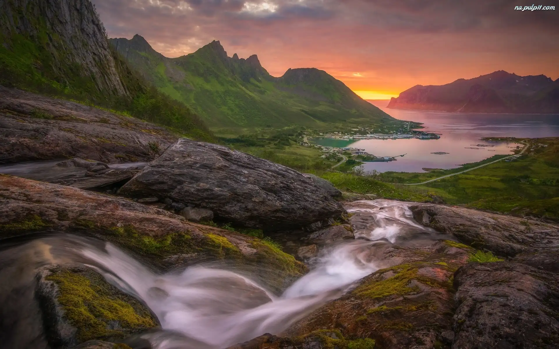 Góry, Morze, Skały, Zachód słońca Na Pulpit