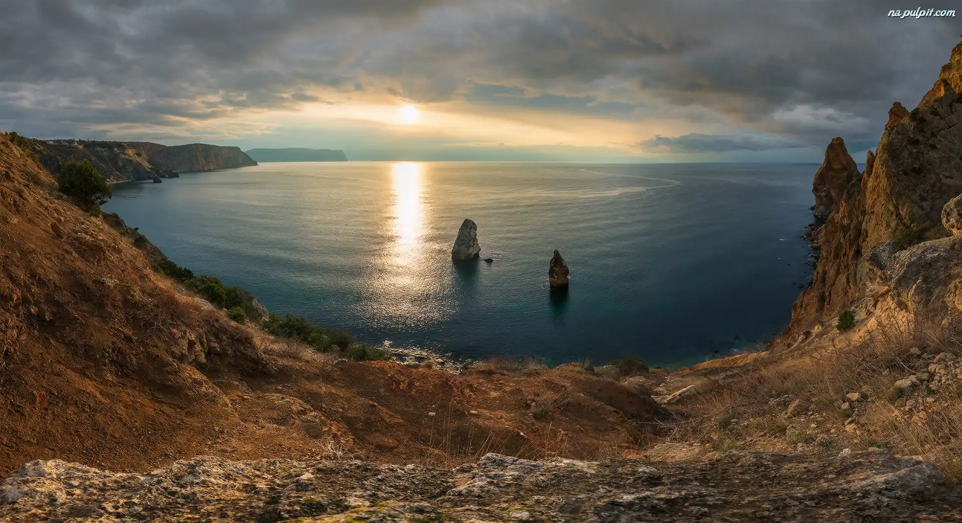 Zachód słońca, Morze Czarne, Skały, Półwysep Krymski, Przylądek Fiolent, Krym, Wybrzeże Na Pulpit |