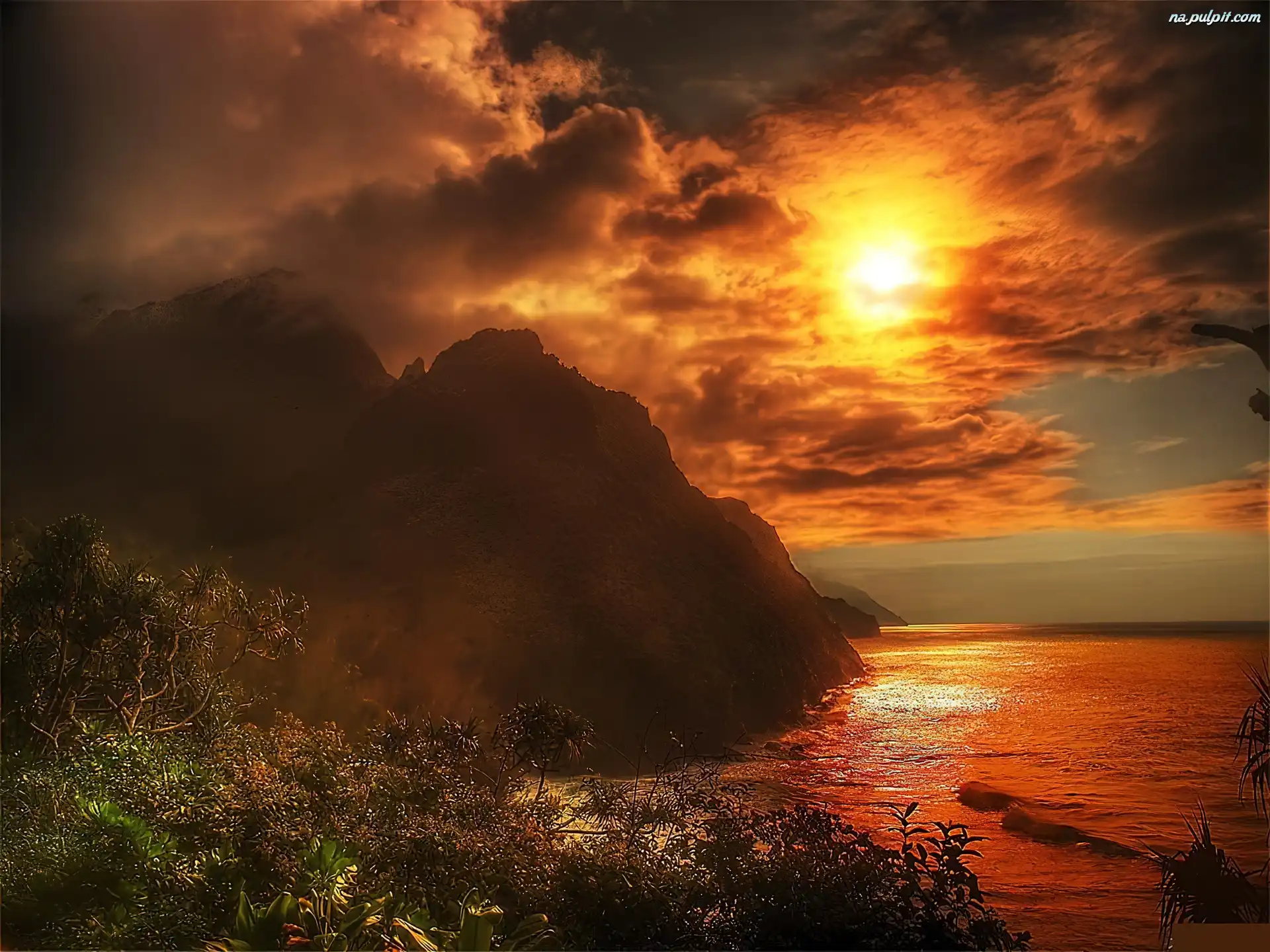 Morze, Zachód Słońca, Góry
