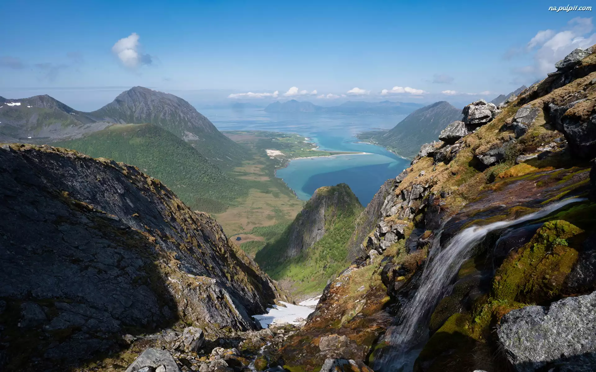 Skały, Norwegia, Góry, Morze, Lofoty, Strumyk