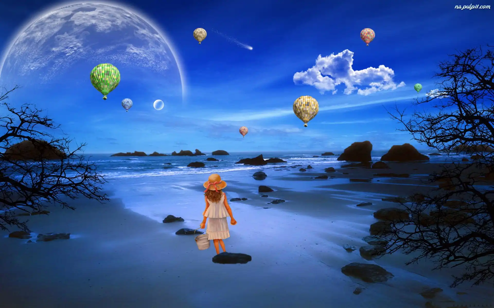 Morze, Dziewczynka, Wybrzeże, Balony Na Pulpit