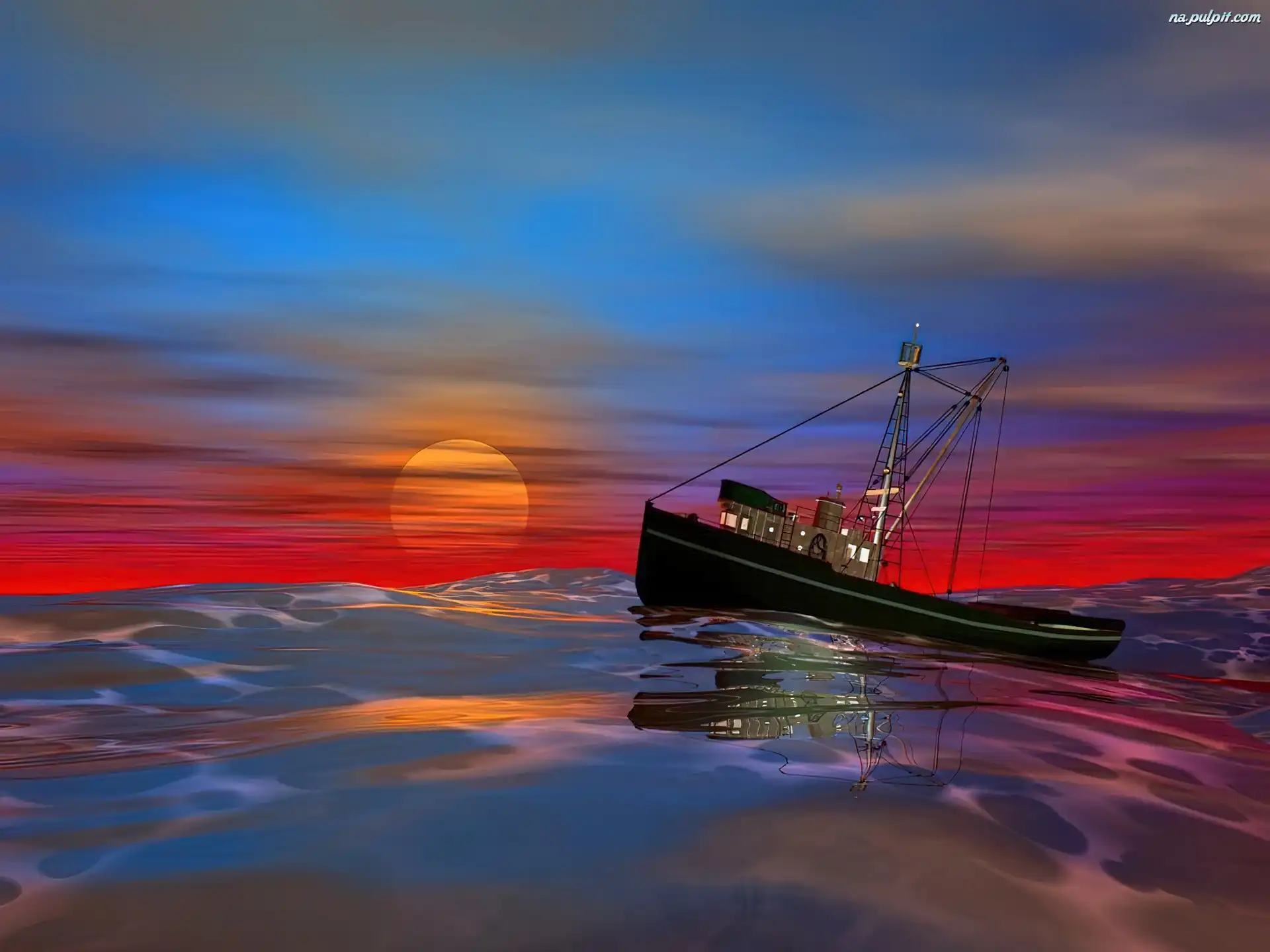 Morze, Kuter, Zachód Słońca