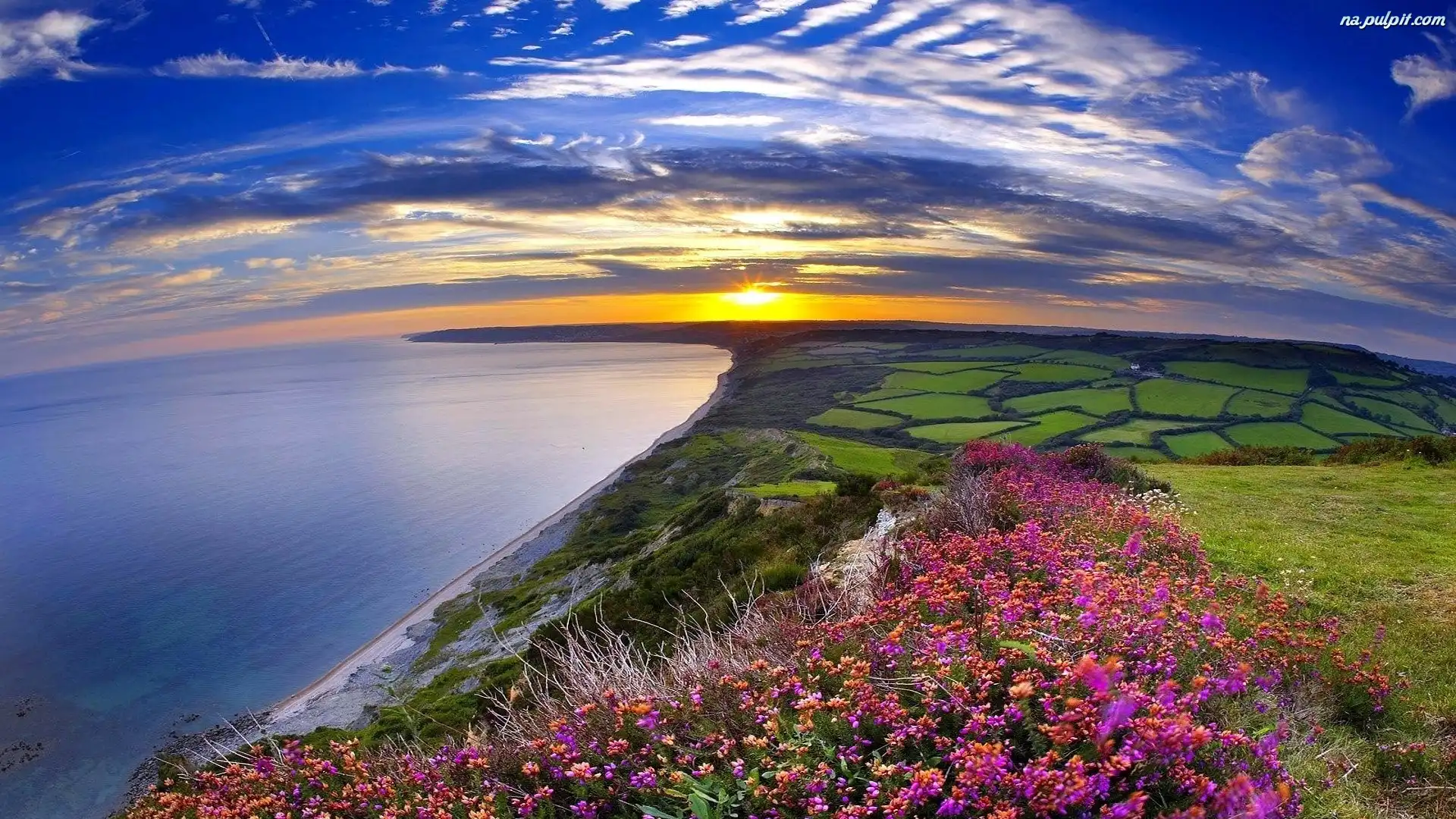 Morze, Słońca, Zachód, Chmury Na Pulpit