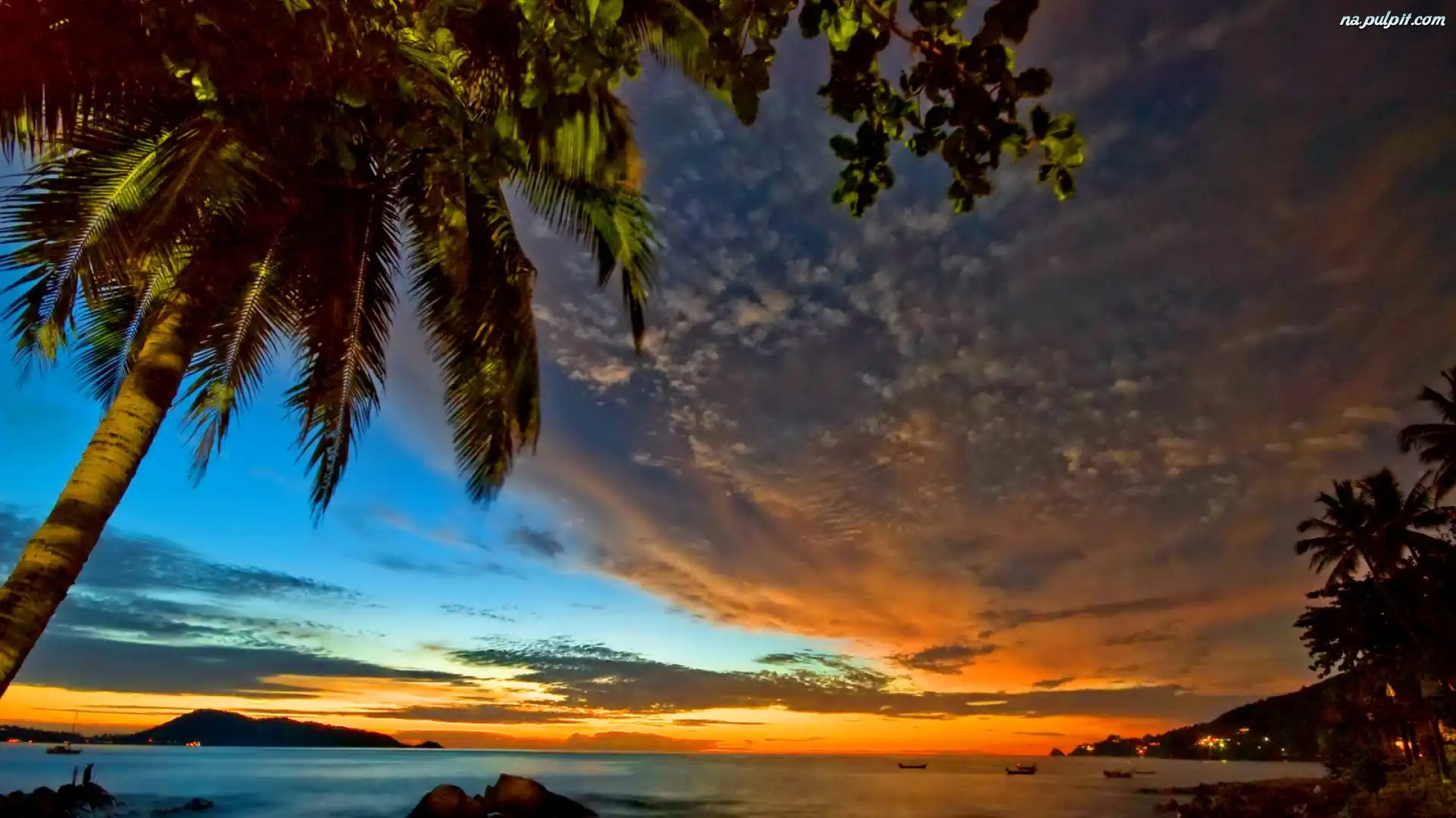 Morze, Chmury, Słońca, Zachód, Palmy Na Pulpit