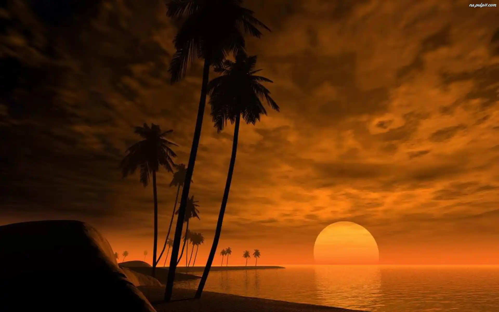 Morze, Słońca, Zachód, Palmy Na Pulpit