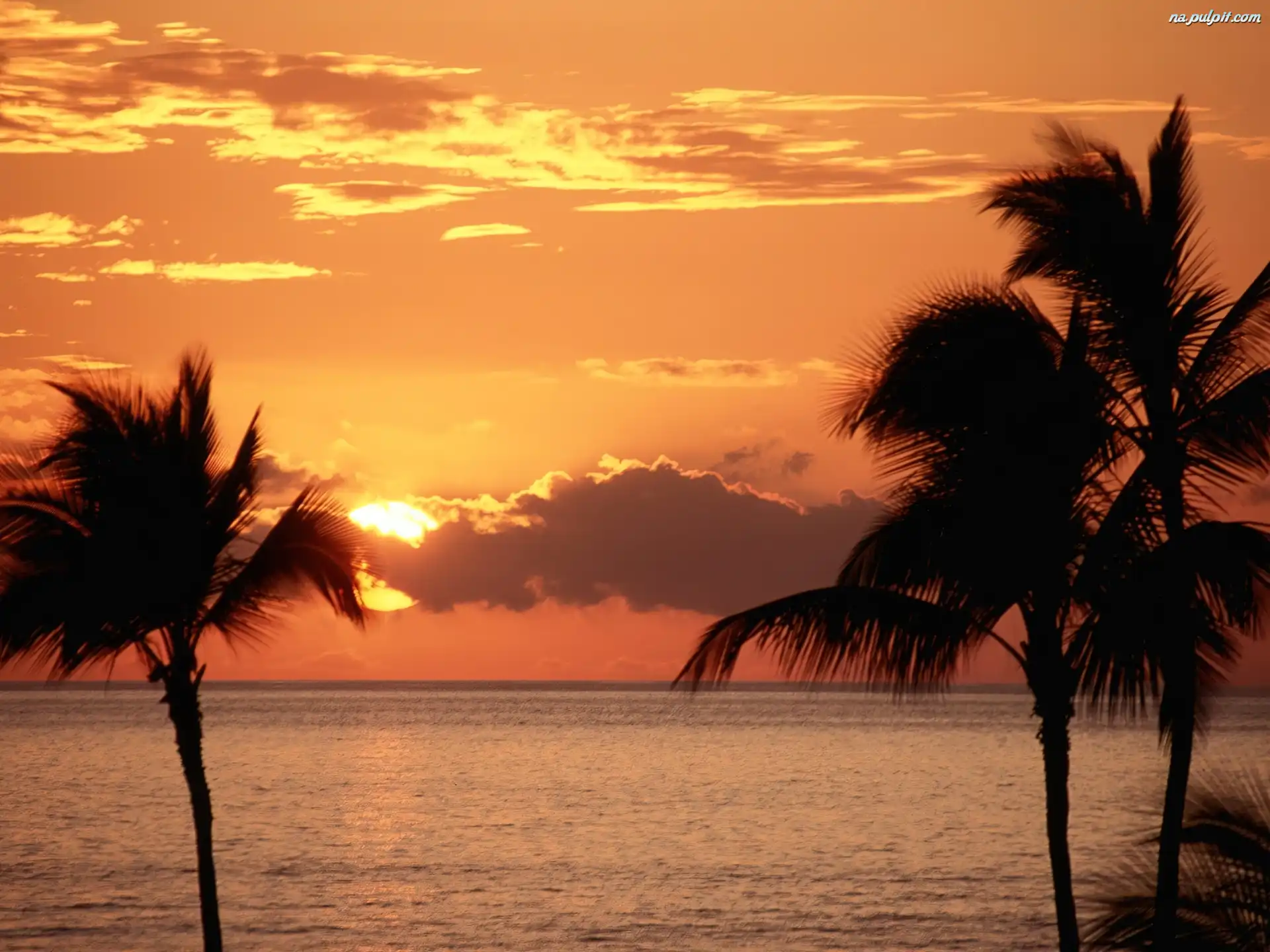 Morze, Promienie, Słońce, Zachód, Palmy Na Pulpit