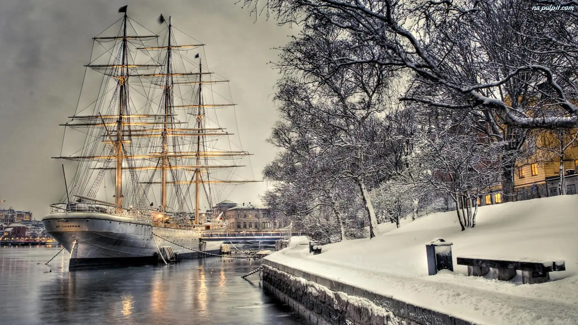 Morze, Konary, Drzew, Brzeg, Zaglowiec, Śnieg Na Pulpit