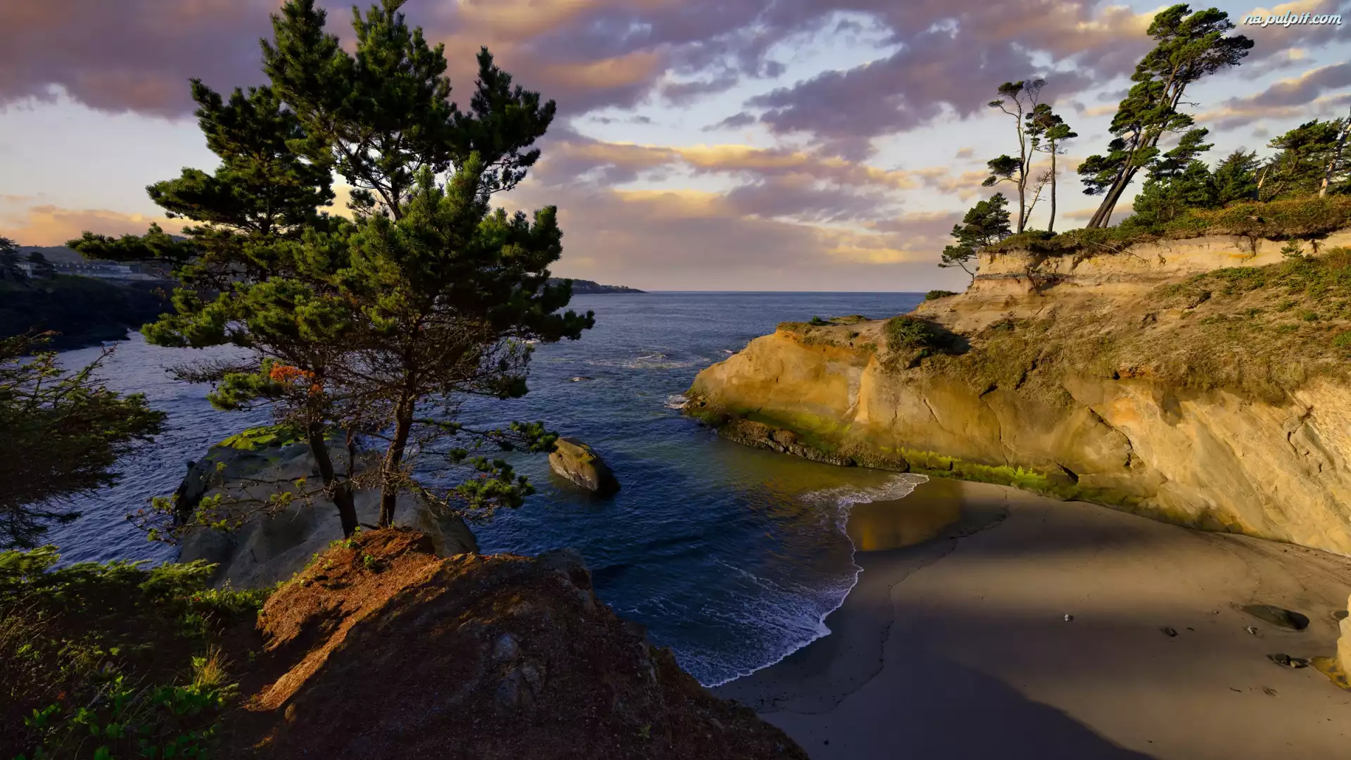 Chmury, Drzewa, Zatoka, Morze, Skały, Wybrzeże, Poranek Na Pulpit