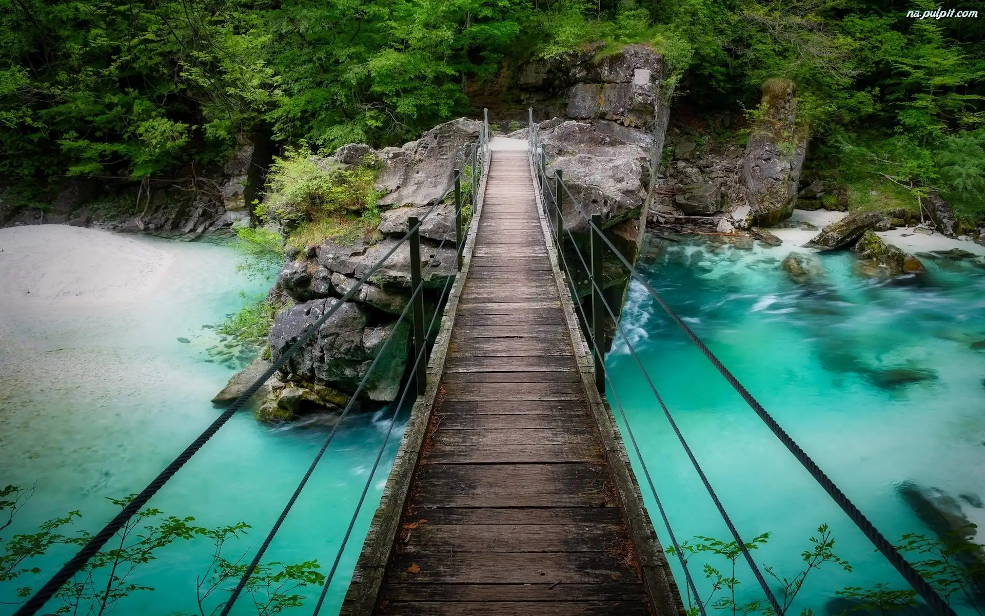 Skały, Słowenia, Drewniany, Most, Rzeka Socza, Drzewa Na Pulpit