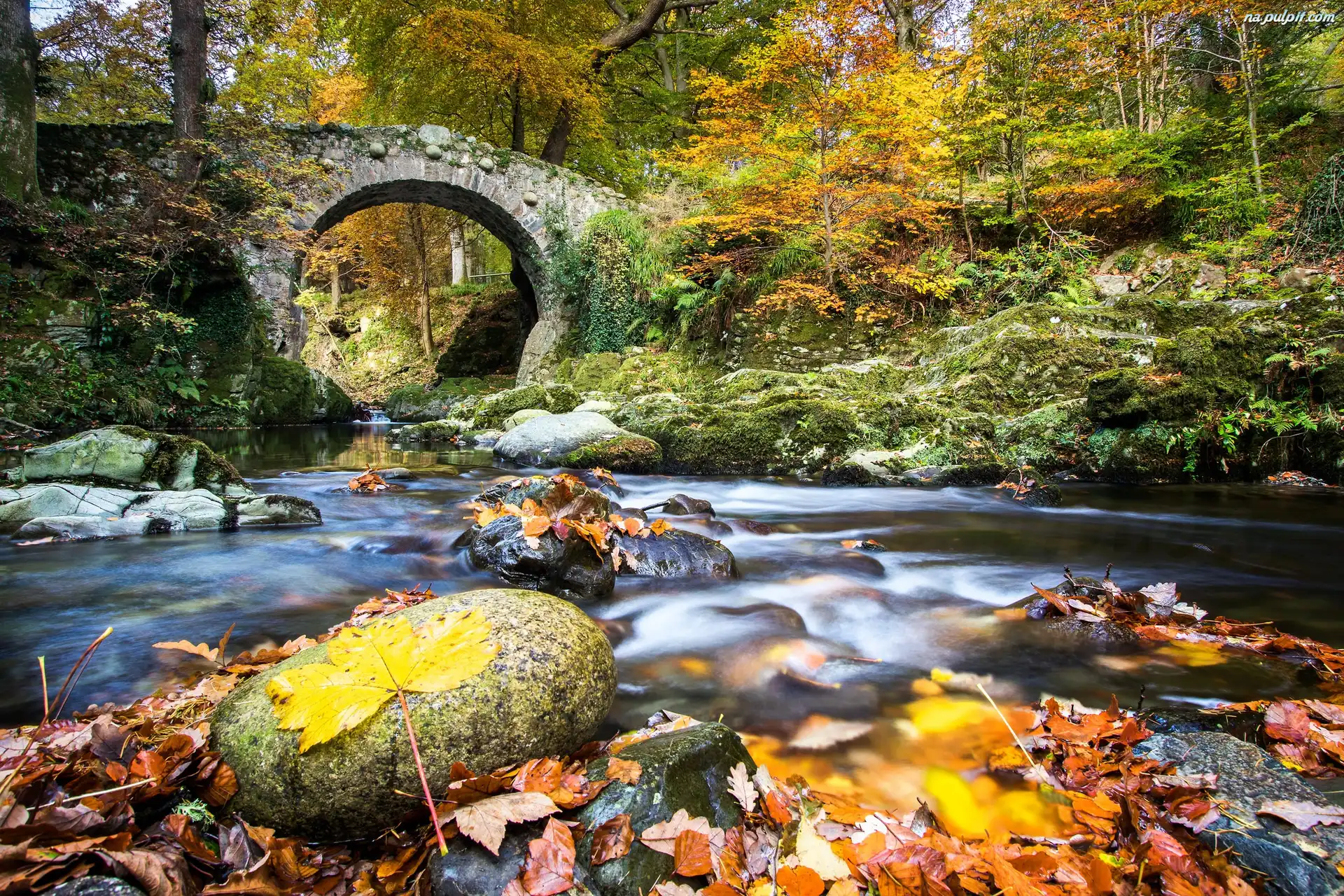 Most, Park Tollymore Forest, Jesień, Las, Kamienie, Liście, Rzeka Shimna, Irlandia Północna, Kamienny Na Pulpit |