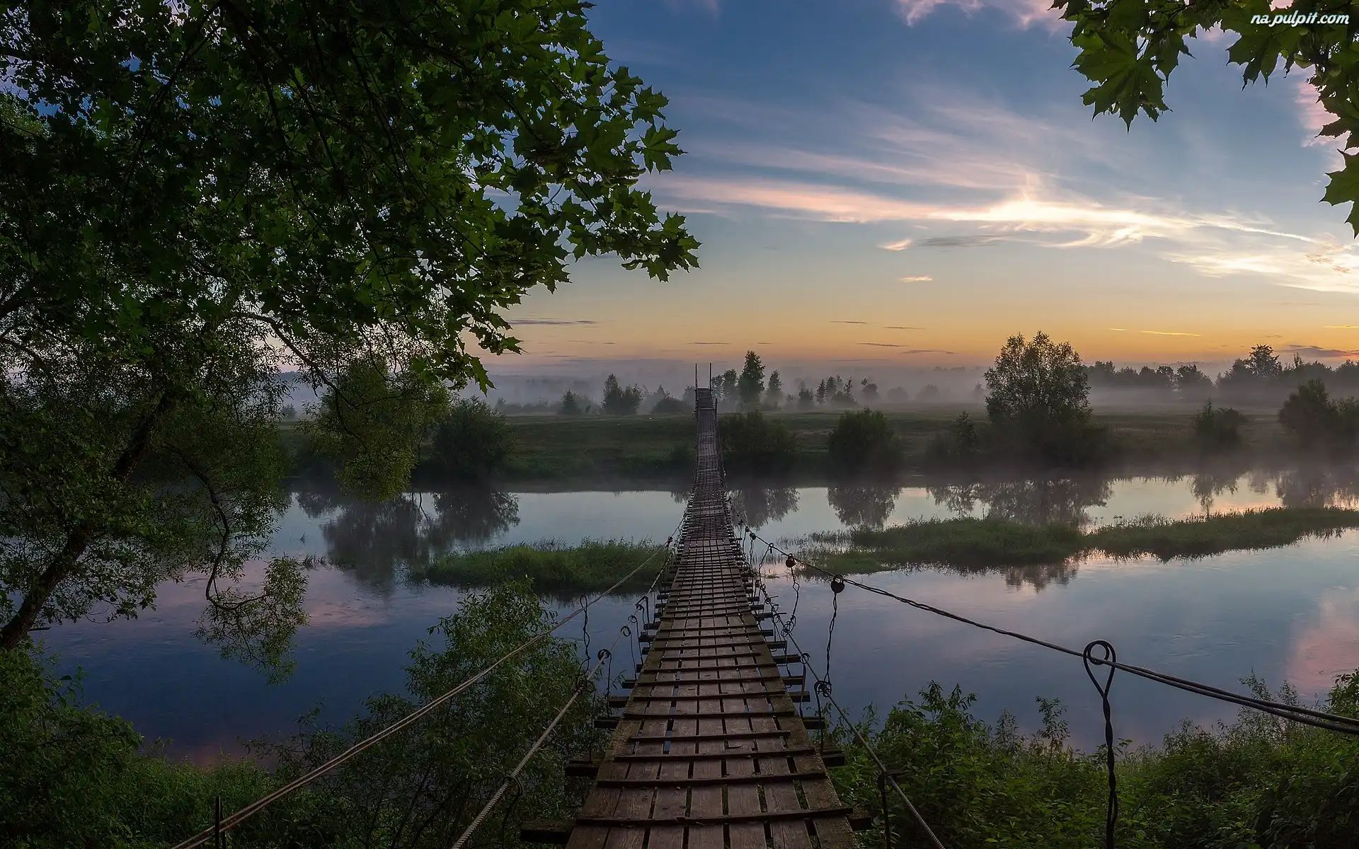 Most, Krzewy, Poranek, Mgła, Rzeka, Drzewa Na Pulpit
