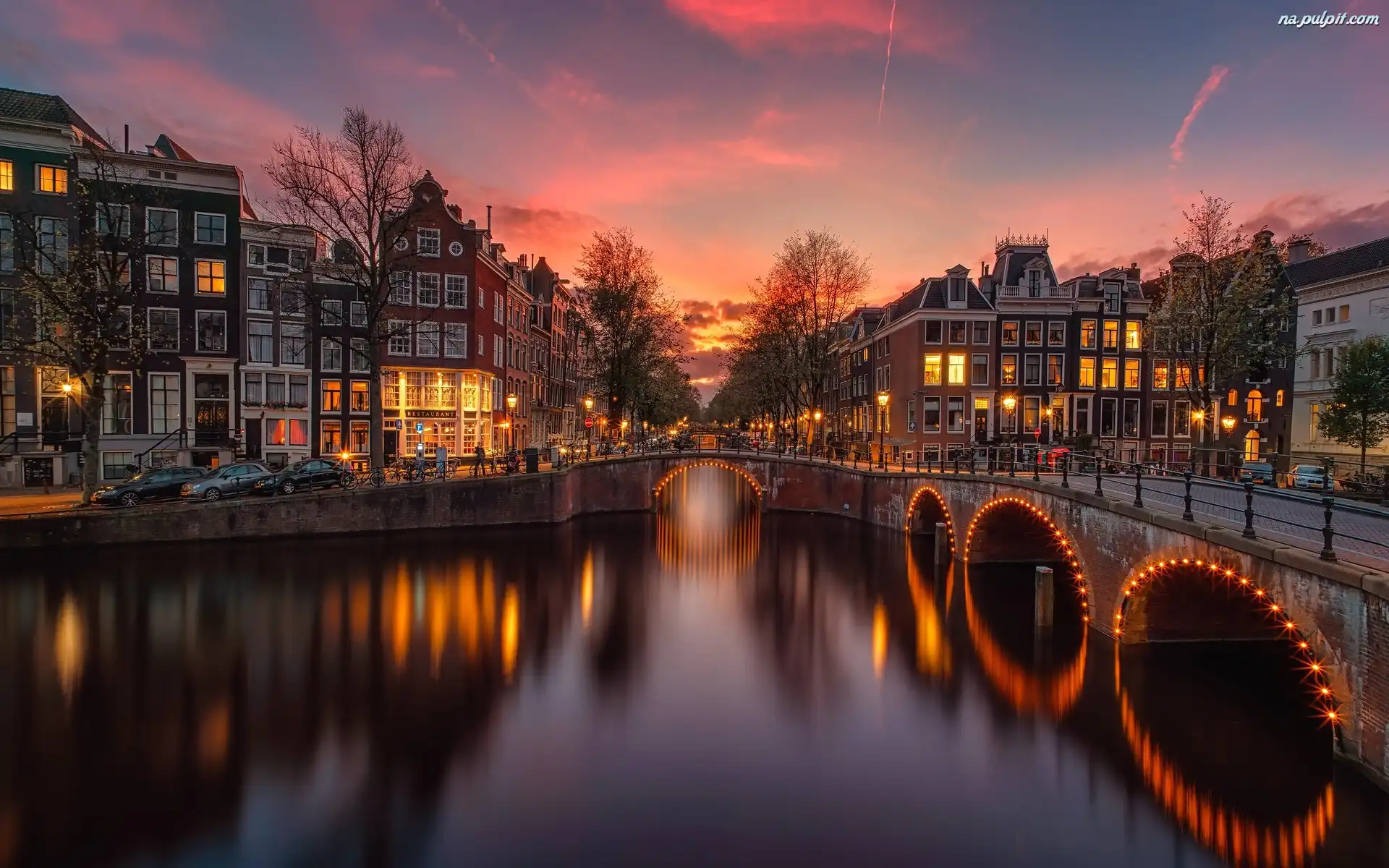 Światła, Zachód słońca, Amsterdam, Kanał Leidsegracht, Most, Rzeka, Holandia, Domy, Drzewa Na Pulpit |