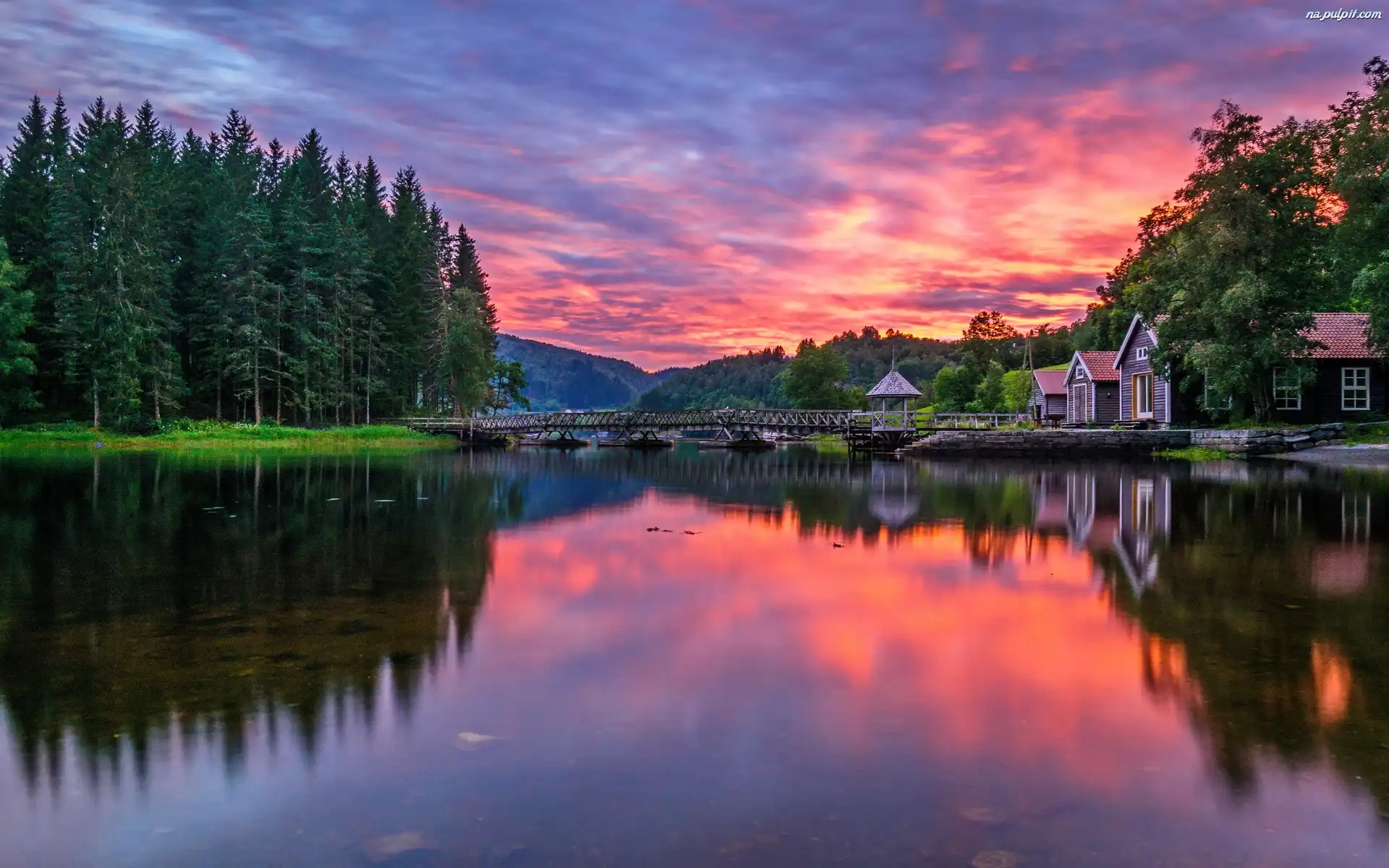 Słońca, Most, Zachód, Lasy, Domy, Rzeka, Góry Na Pulpit
