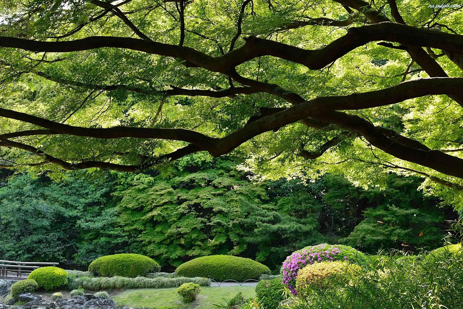 Mostek, Drzewo, Rozłożyste, Park, Klomby Na Pulpit