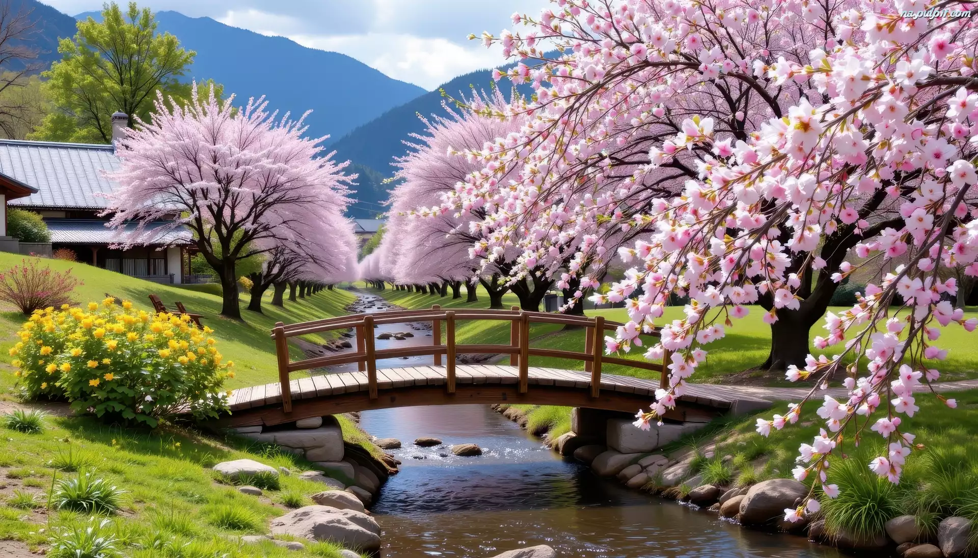 Kwiaty, Wiosna, Drzewa, Mostek, Kwitnace, Rzeka Na Pulpit