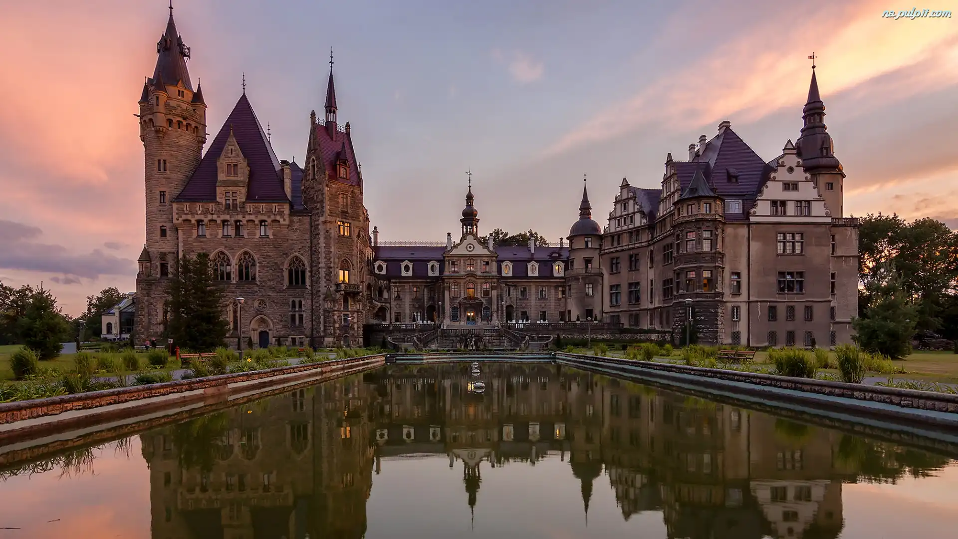 Polska, Moszna, Pałac w Mosznej, Zachód słońca, Opolskie Na Pulpit