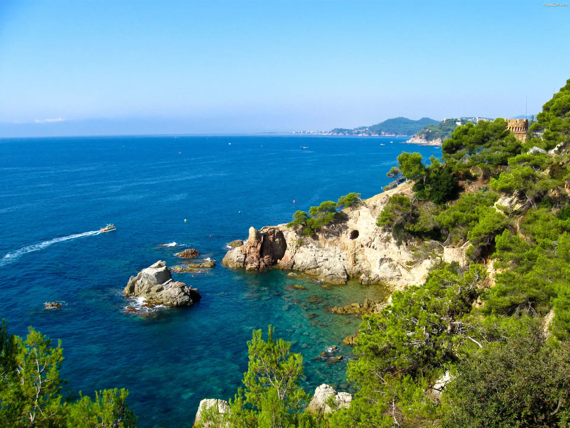 Motorówka, Skała, Morze, Zieleń Na Pulpit