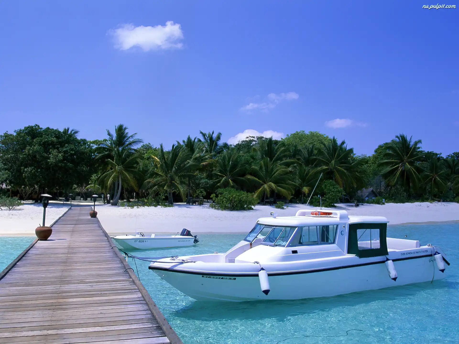 Motorówka, Palmy, Plaża, Pomost Na Pulpit