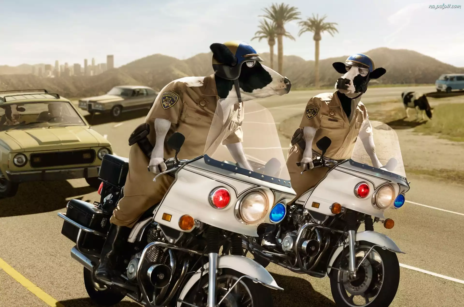 Motory, Krowy, Samochody, Droga, Policja