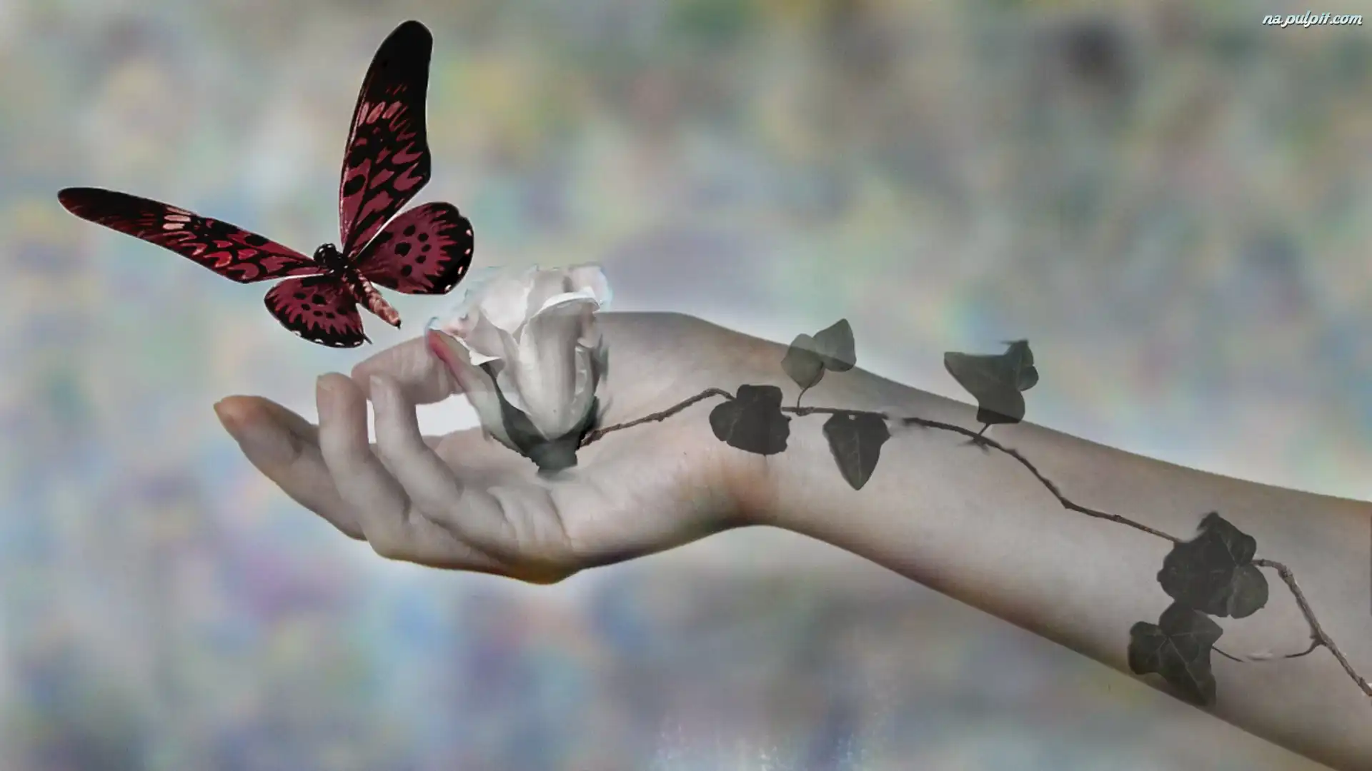 Motyl, Bluszcz, Róża, Biała, Ręka