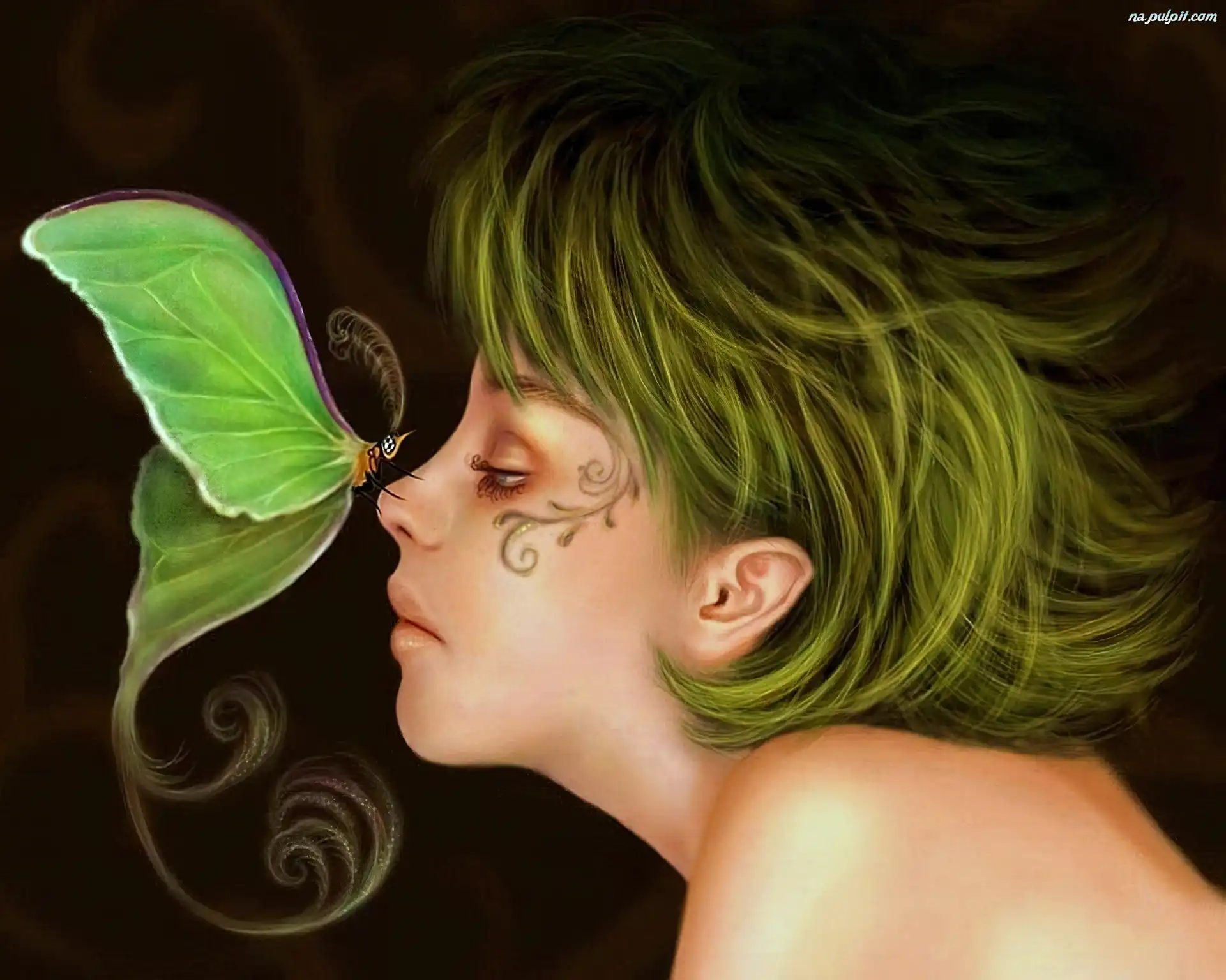 Motyl, Włosy, Zielone, Kobieta, Tatuaż Na Pulpit