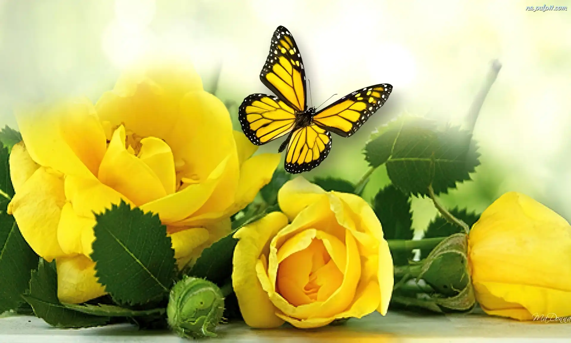 Motyl, Żółte, Róże, Liście Na Pulpit