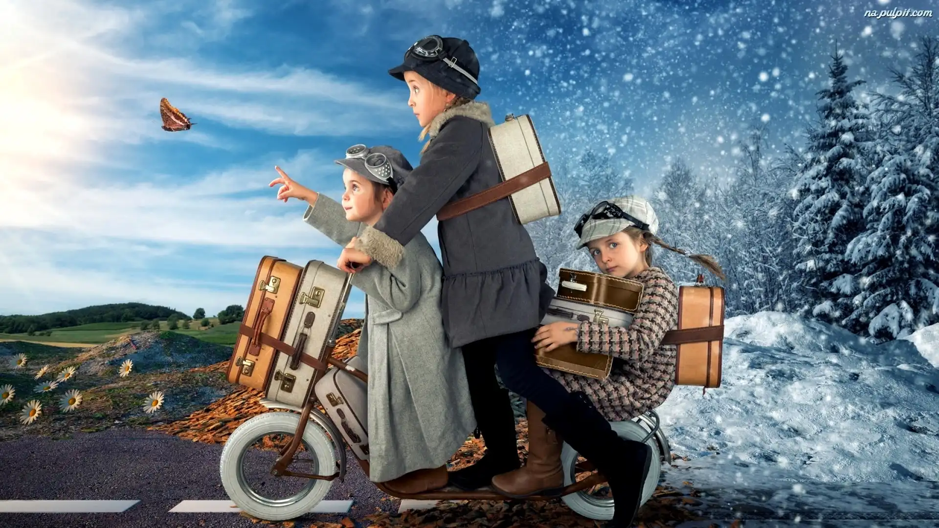 Motylek, Hulajnoga, Dziewczynki, Trzy, Walizki