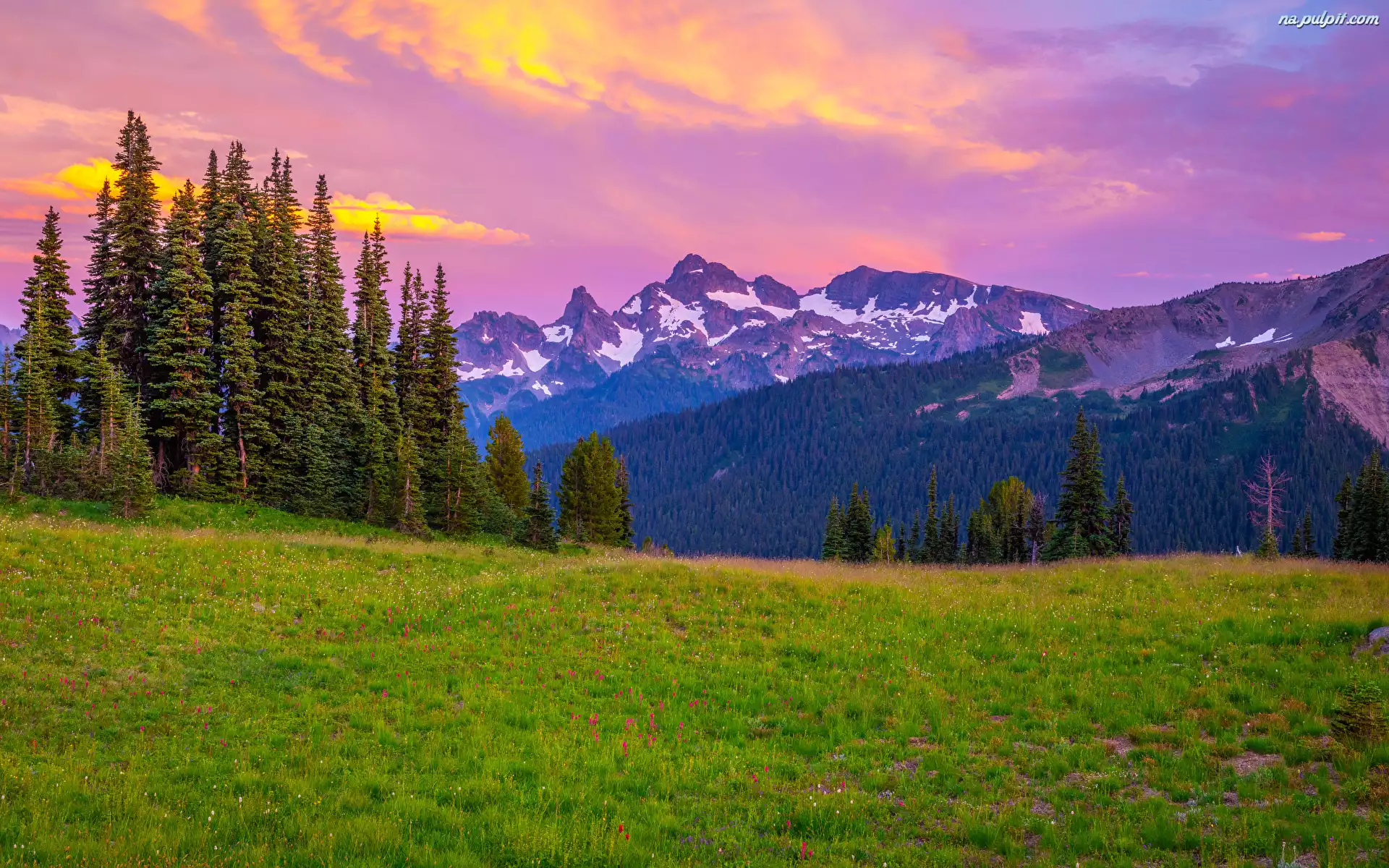 Kolorowe, Niebo, Stan Waszyngton, Góry, Śnieg, Park Narodowy Mount Rainier, Stany Zjednoczone, Trawa, Drzewa Na Pulpit |