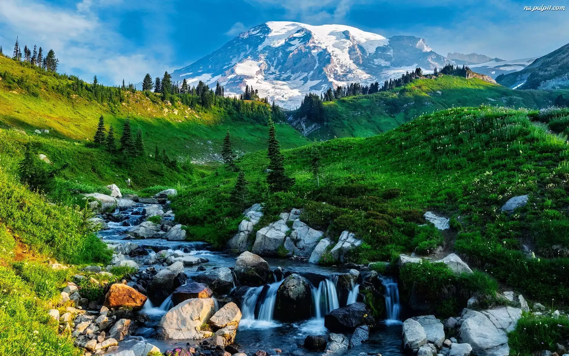 Kamienie, Drzewa, Góra, Park Narodowy Mount Rainier, Dolina, Mount Rainier, Stany Zjednoczone, Potok, Łąka Na Pulpit |