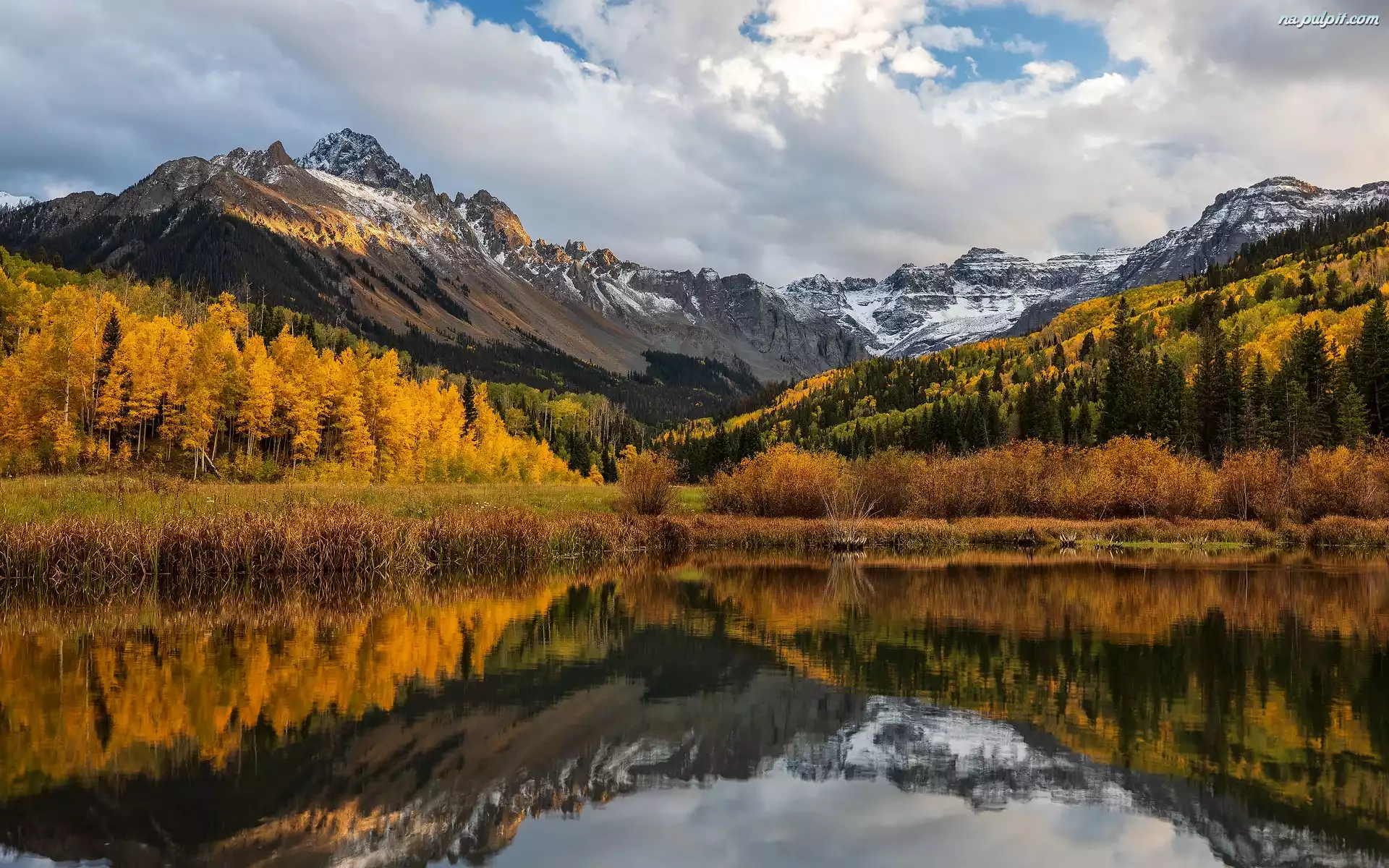 Las, Góra, Stan Kolorado, Jezioro, Mount Sneffels, Chmury, Drzewa, Góry, Jesień, San Juan Mountains, Blue Lake, Stany Zjednoczone Na Pulpit |