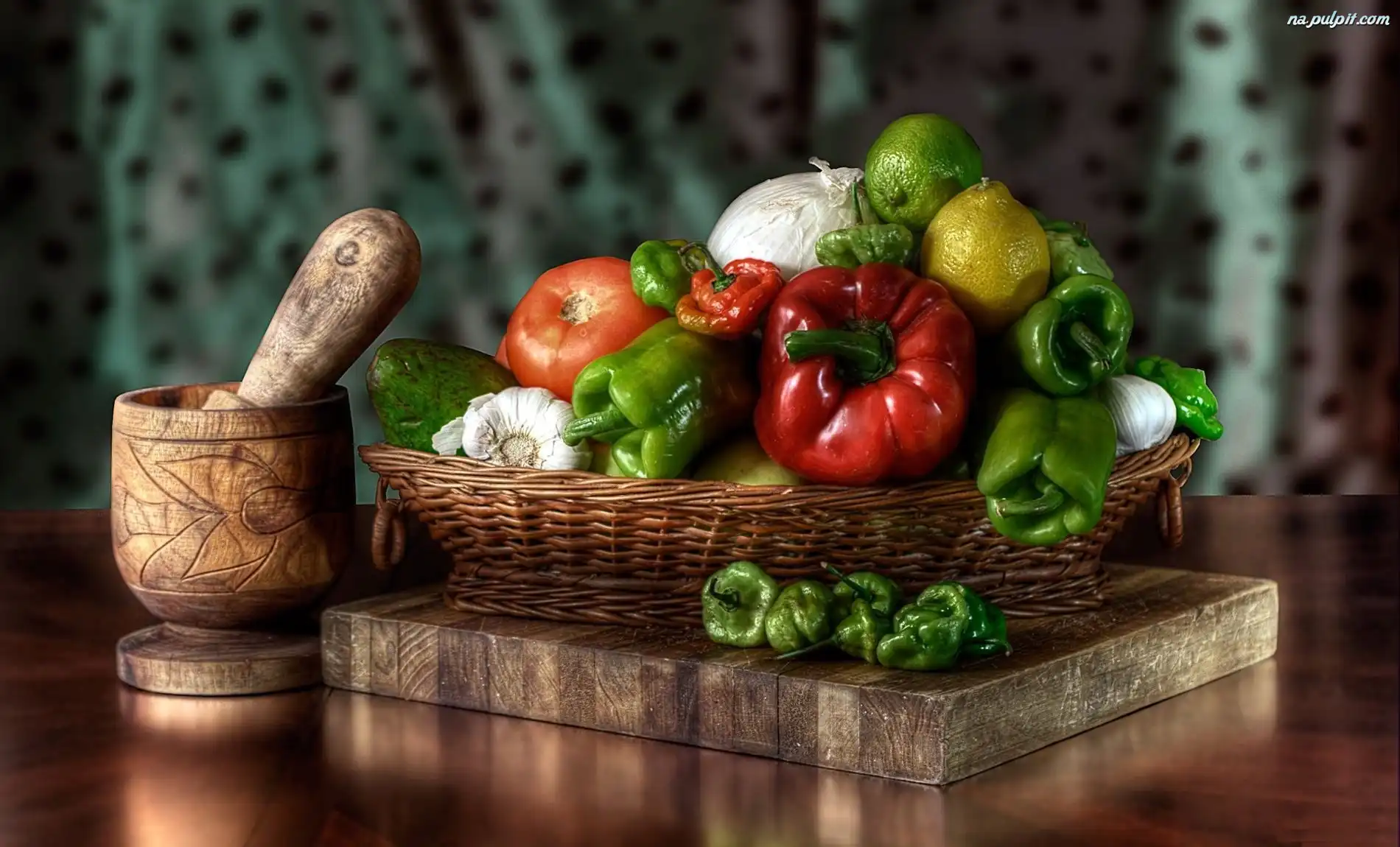 Deska, Moździerz, Papryka, Kosz, Drewniana, Warzywa Na Pulpit