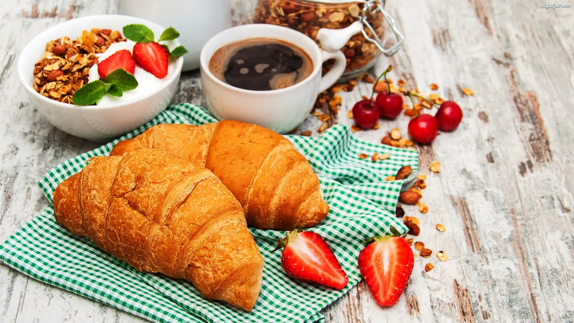 Rogale, Ściereczka, Truskawki, Croissanty, Miseczka, Kawa, Filiżanka, Wiśnie, Śniadanie, Musli Na Pulpit |