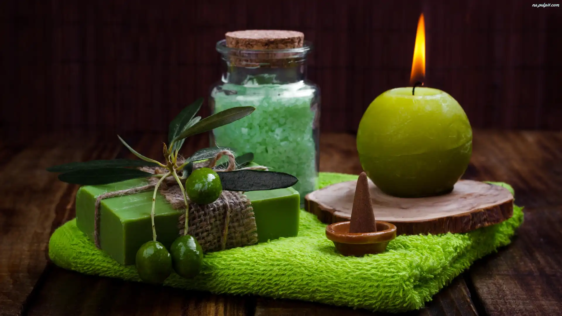 Kompozycja, Mydło, SPA, Oliwki, Sól, Świeczka, Ręcznik Na Pulpit