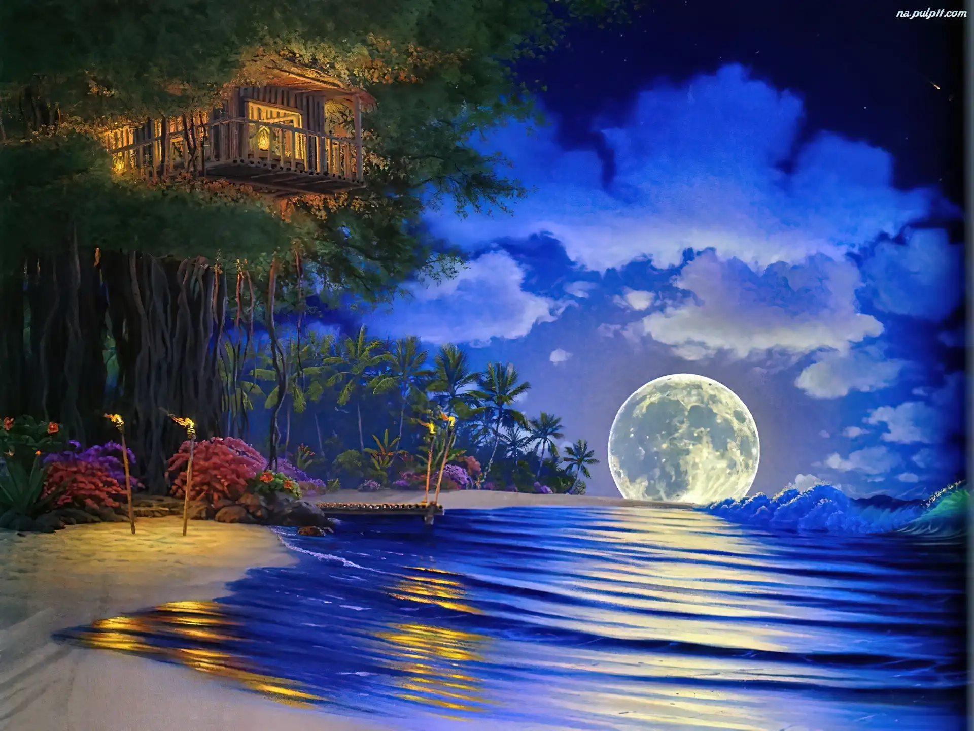 Na, Woda, Księżyc, Drzewie, Dom, Palmy Na Pulpit
