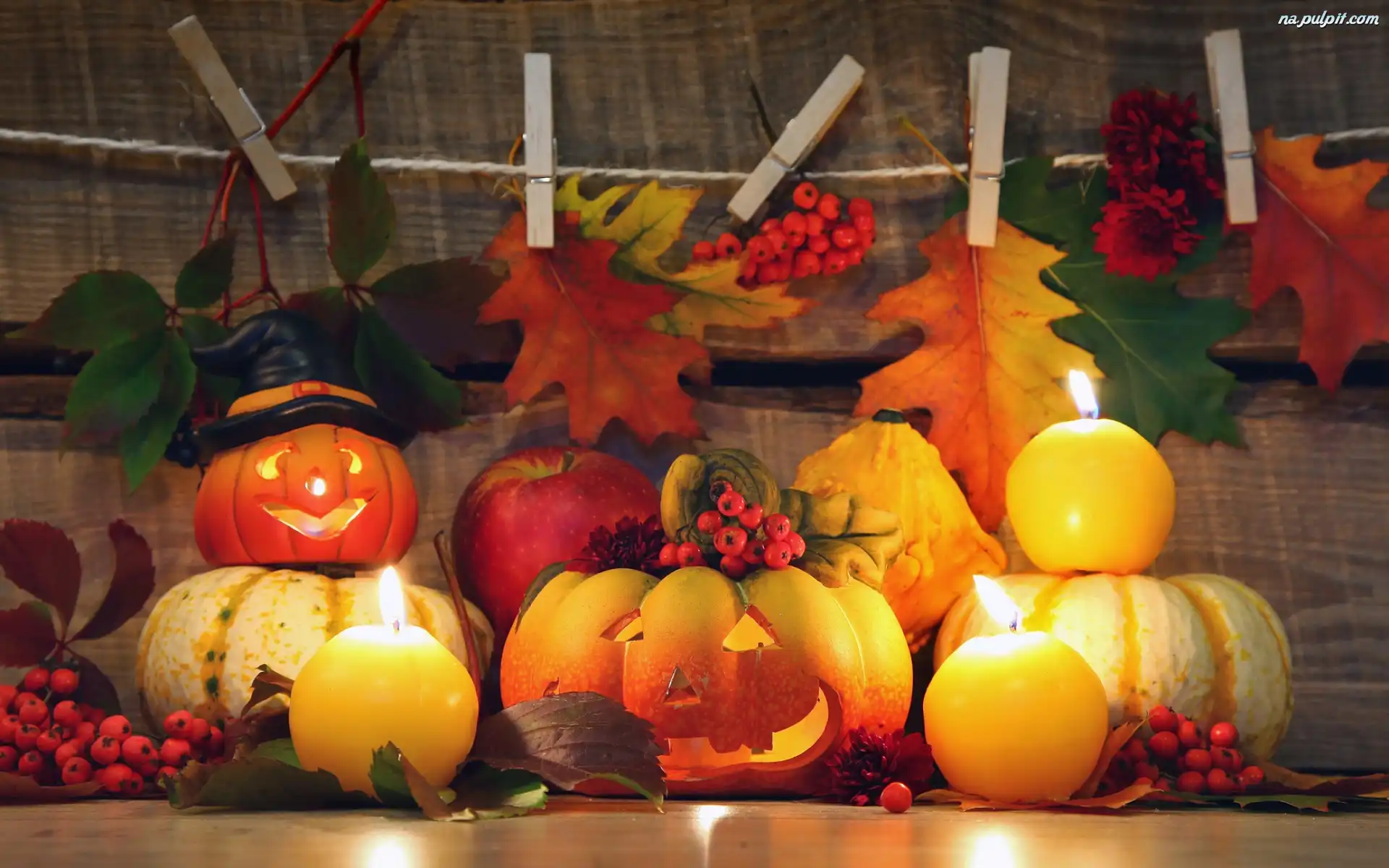 Liście, Na, Jarzębina, Dynie, Halloween, Dekoracja, Świece Na Pulpit