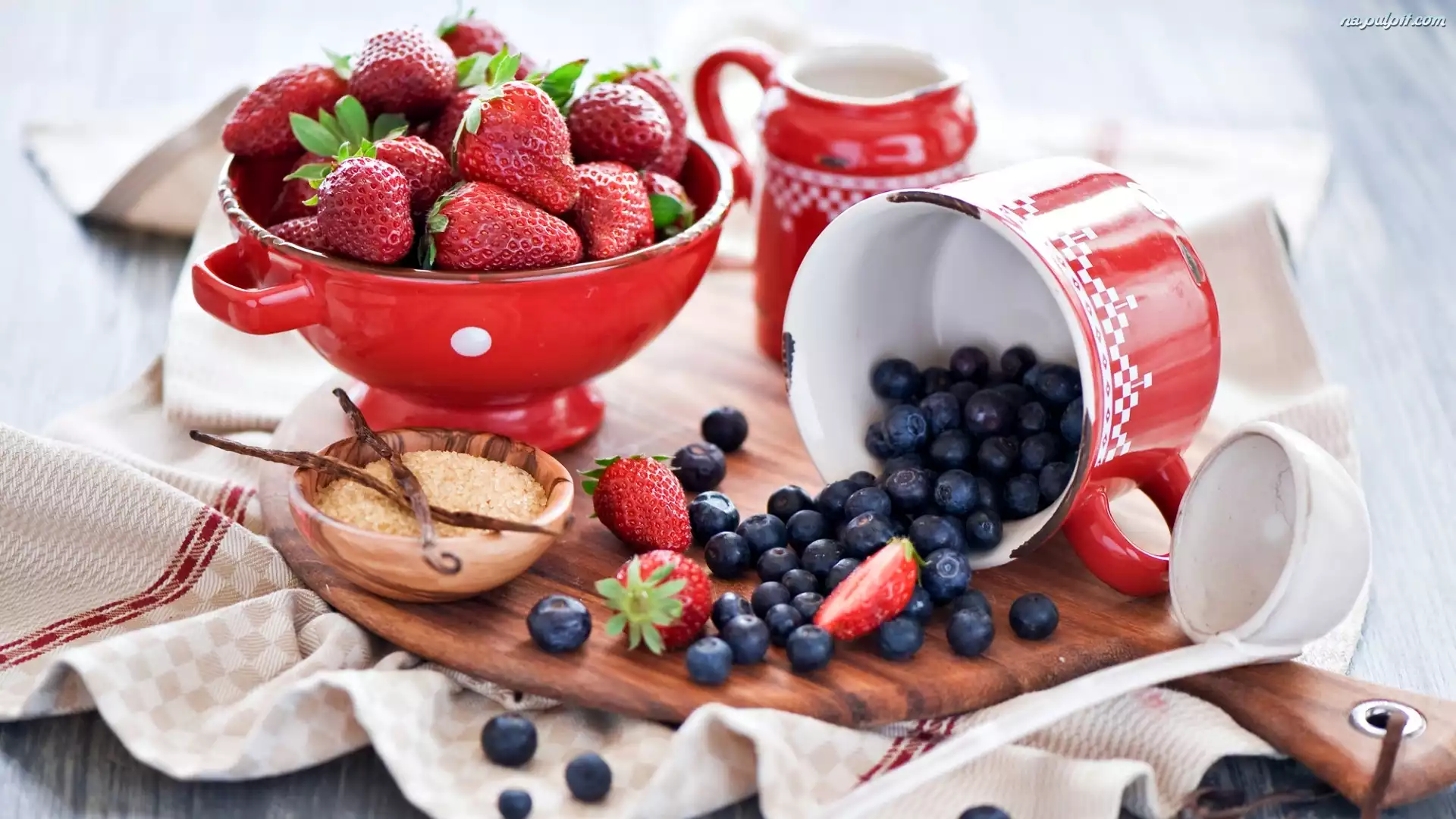 Truskawki, Naczynia, Miseczka, Jagody, Cukier, Garnuszek, Czerwone, Dzbanuszek Na Pulpit